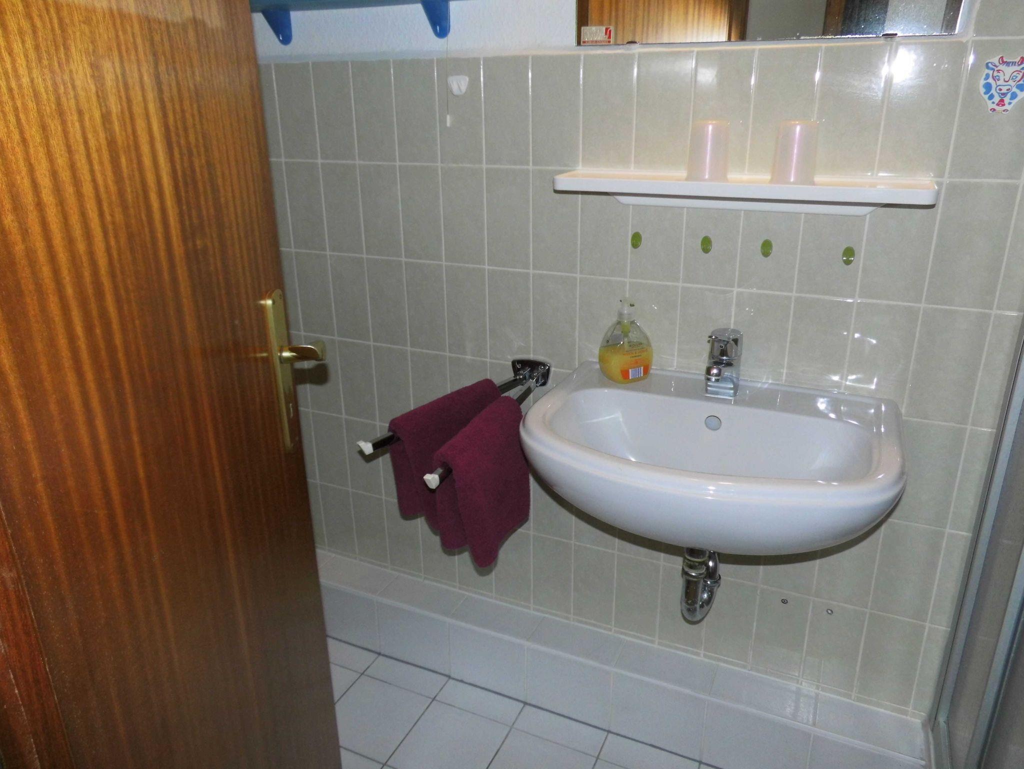 • Badezimmer mit Dusche, WC, Waschbecken.