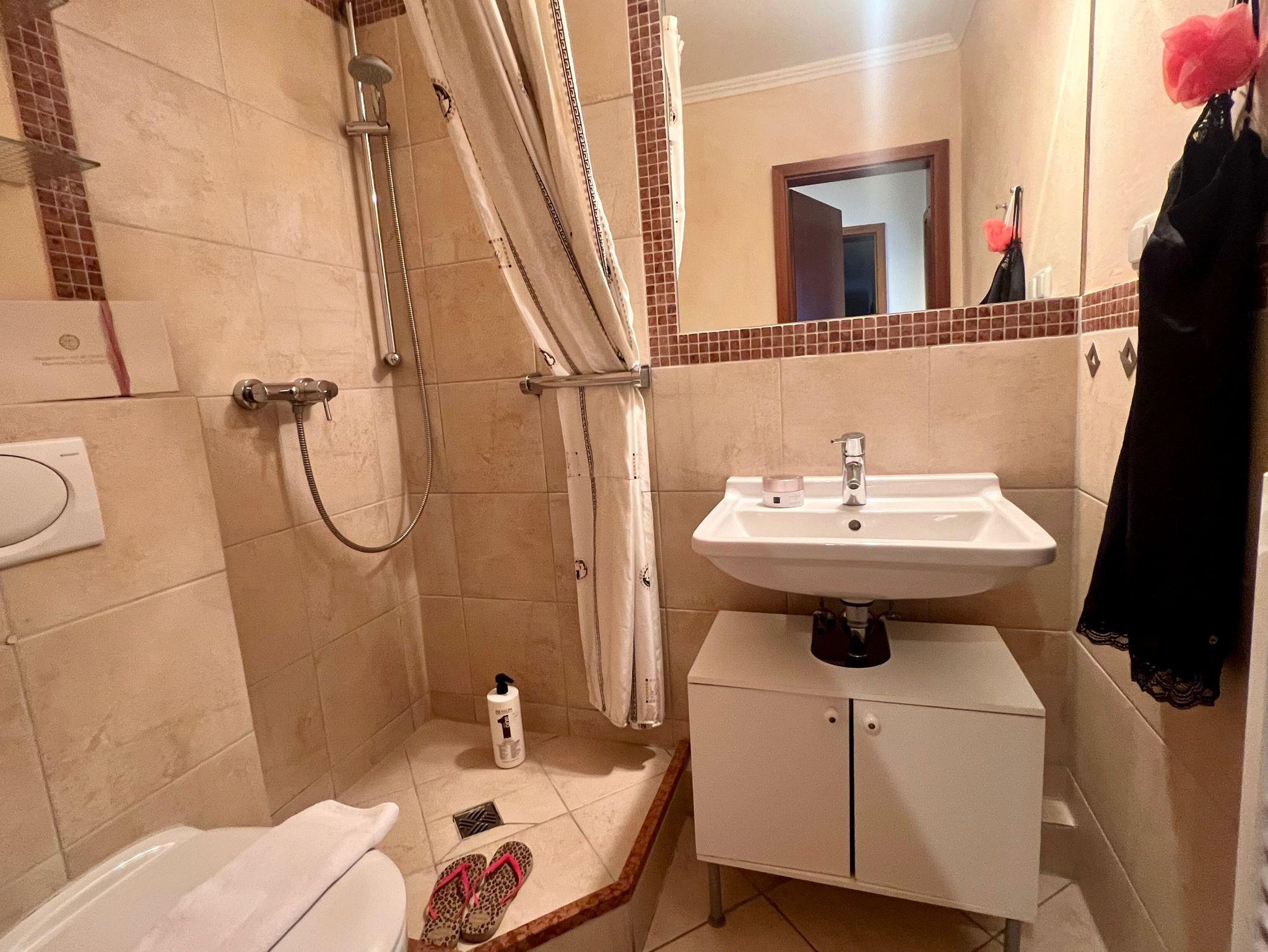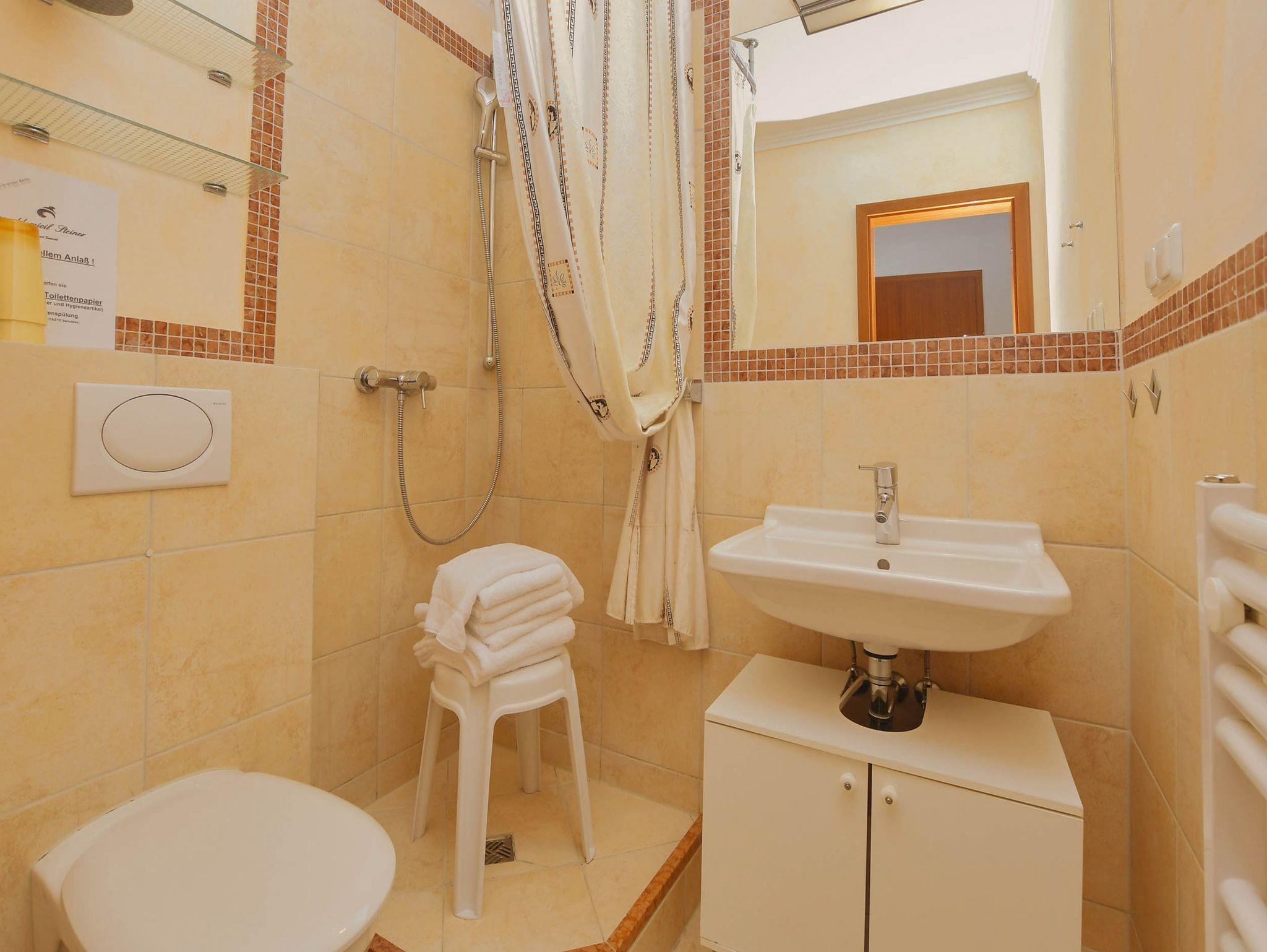 • Dusche, WC, Waschtisch mit großem Spiegel und Ablageflächen