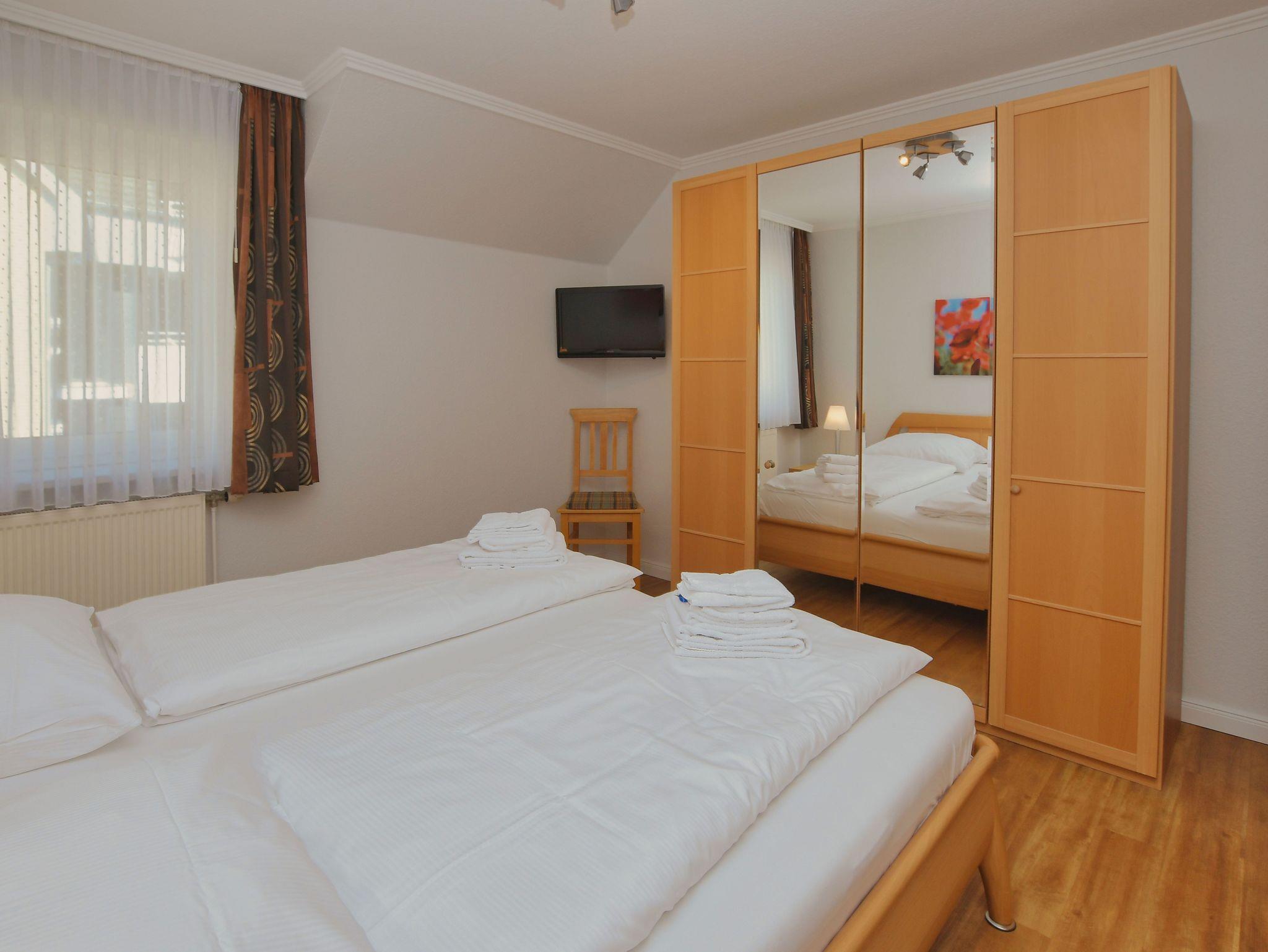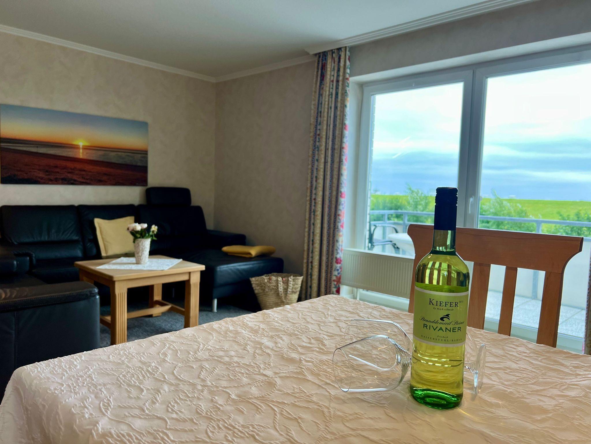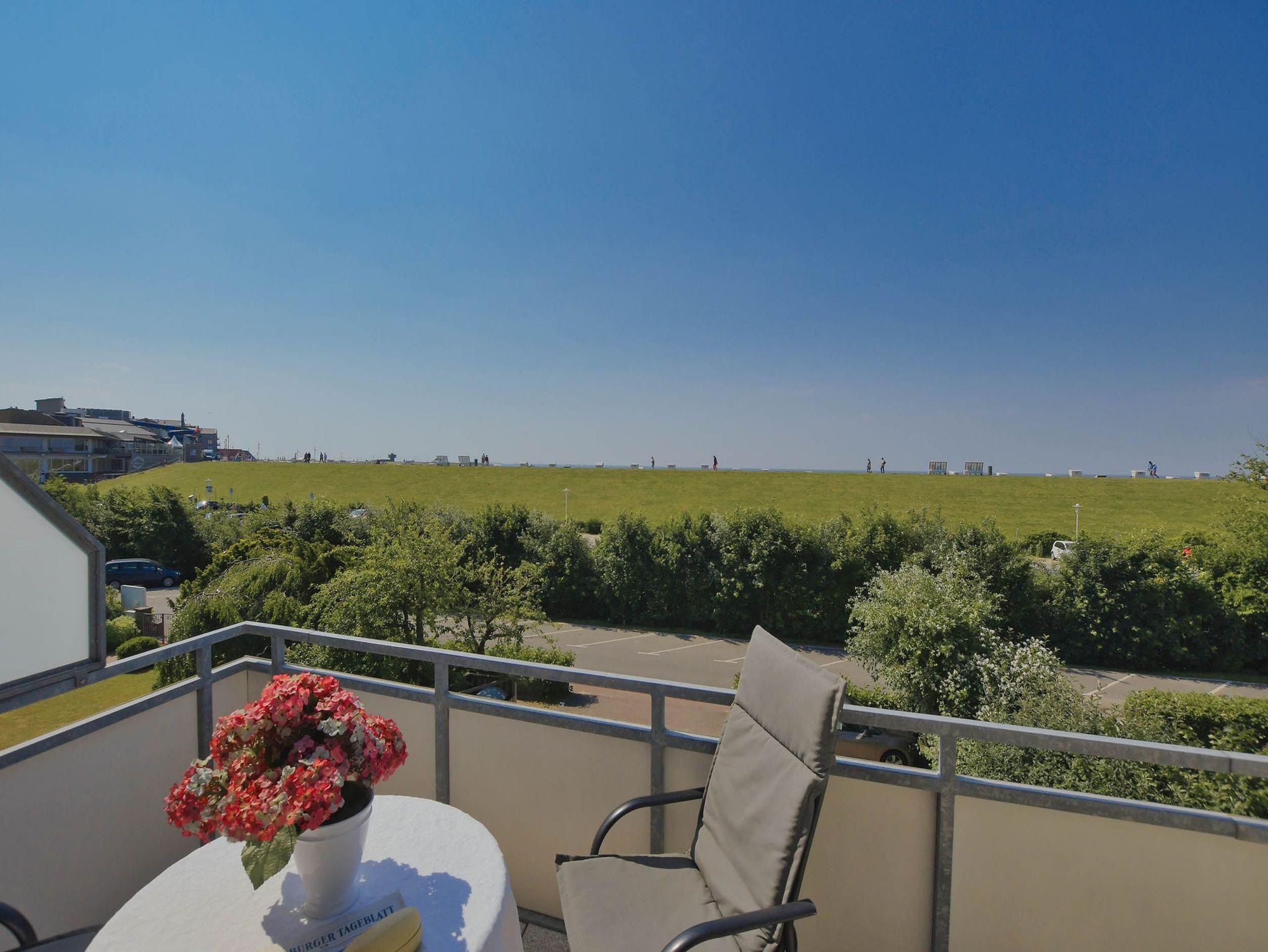 Appartement mit Blick über den Deich (bedingter Meerblick). Die beiden Schlafzimmer sind ruhig gelegen zur Rückseite des Hauses. Geräumiges Schlafzimmer mit Doppelbett, großem Kleiderschrank und einem Ganzkörperspiegel. 2. Schlafzimmer mit Einzelbetten und Kleiderschrank. Wohnzimmer mit hochwertiger Schlafcouch, Sitzgruppe, Fernseher, Stereoanlage, Eßplatz und Küchenzeile.
