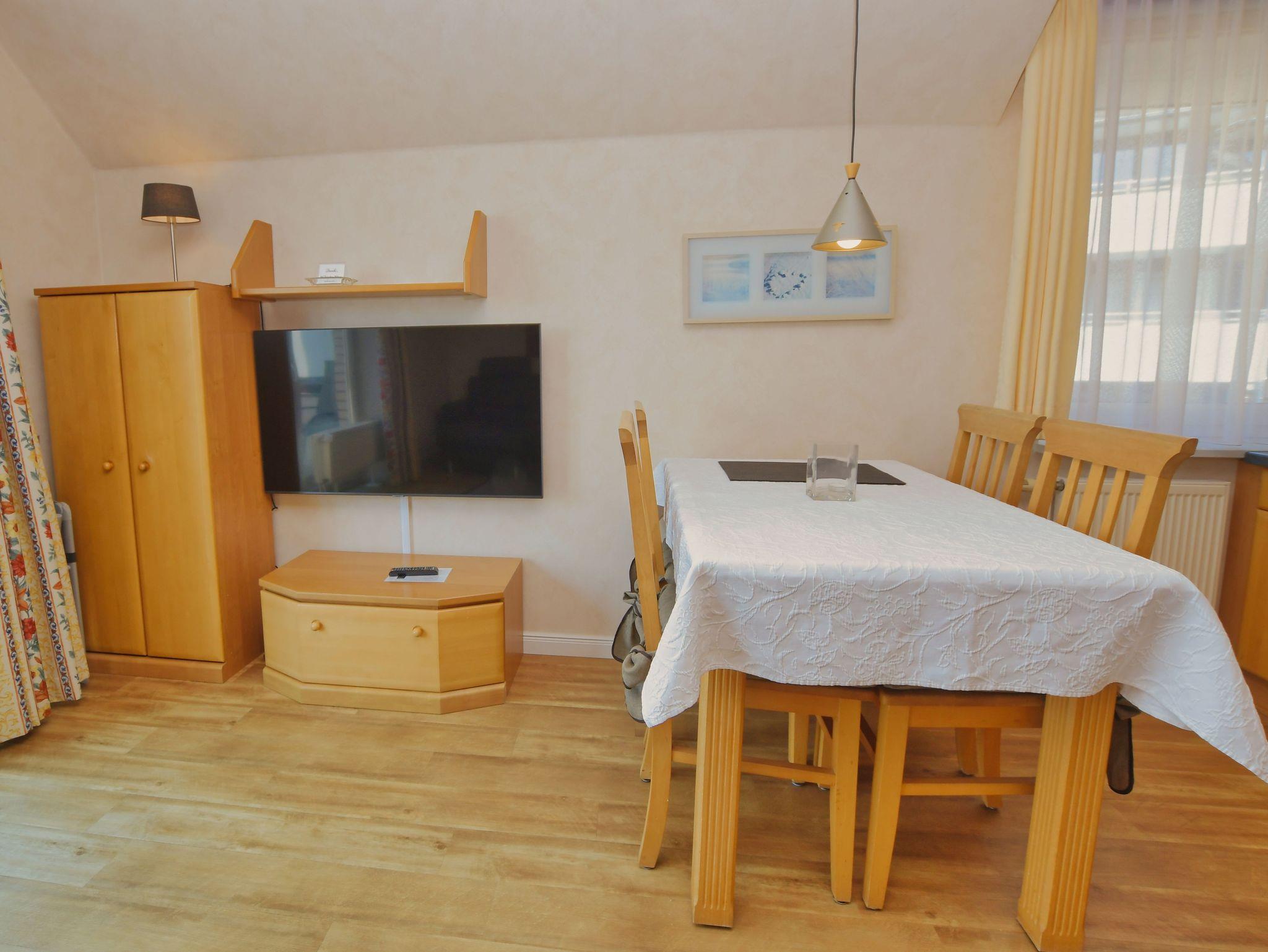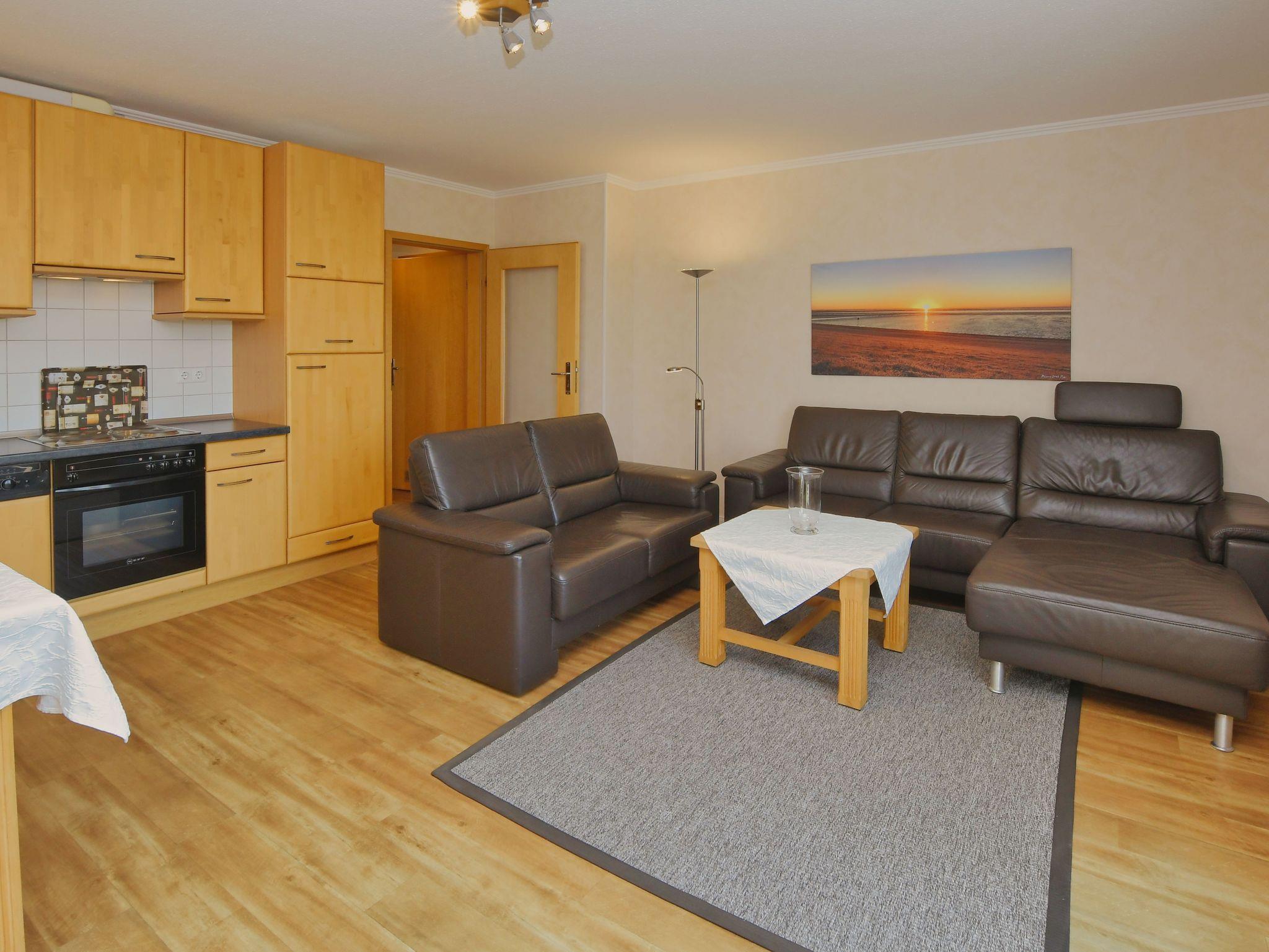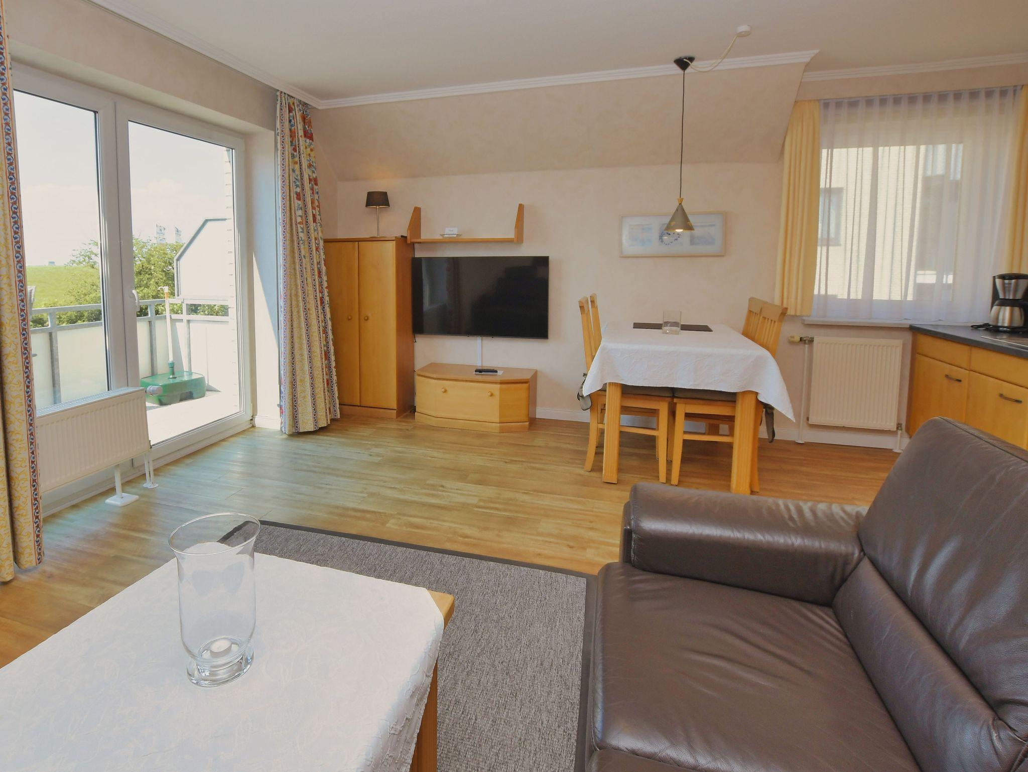 Appartement mit Blick über den Deich (bedingter Meerblick). Die beiden Schlafzimmer sind ruhig gelegen zur Rückseite des Hauses. Geräumiges Schlafzimmer mit Doppelbett, großem Kleiderschrank und einem Ganzkörperspiegel. 2. Schlafzimmer mit Einzelbetten und Kleiderschrank. Wohnzimmer mit hochwertiger Schlafcouch, Sitzgruppe, Fernseher, Stereoanlage, Eßplatz und Küchenzeile.