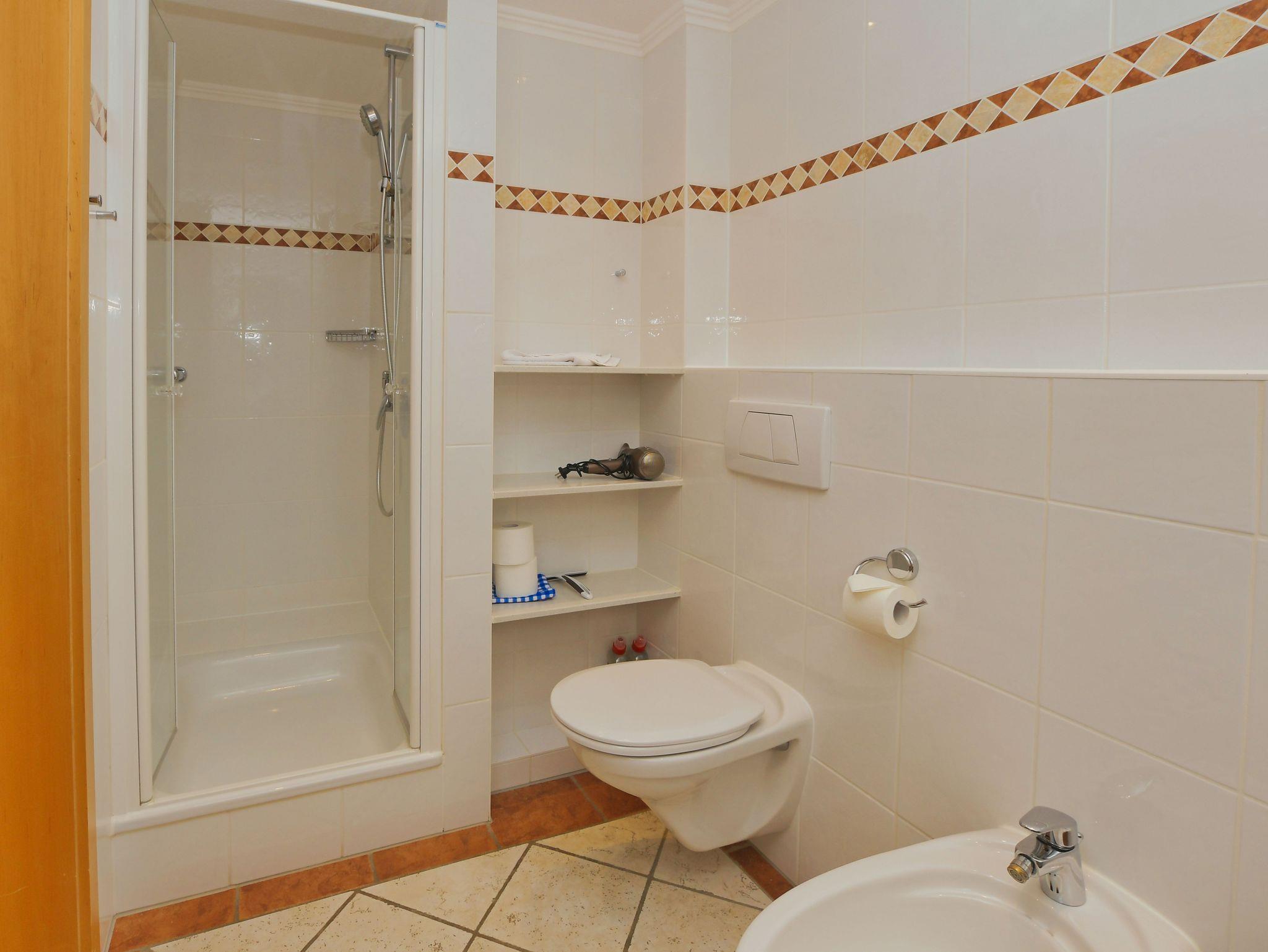 Modernes Bad mit Dusche, WC, Bidet, großem Waschtisch mit Spiegel, ausreichend Ablageflächen, Fußbodenheizung, Handtuchtrockner und Radio.