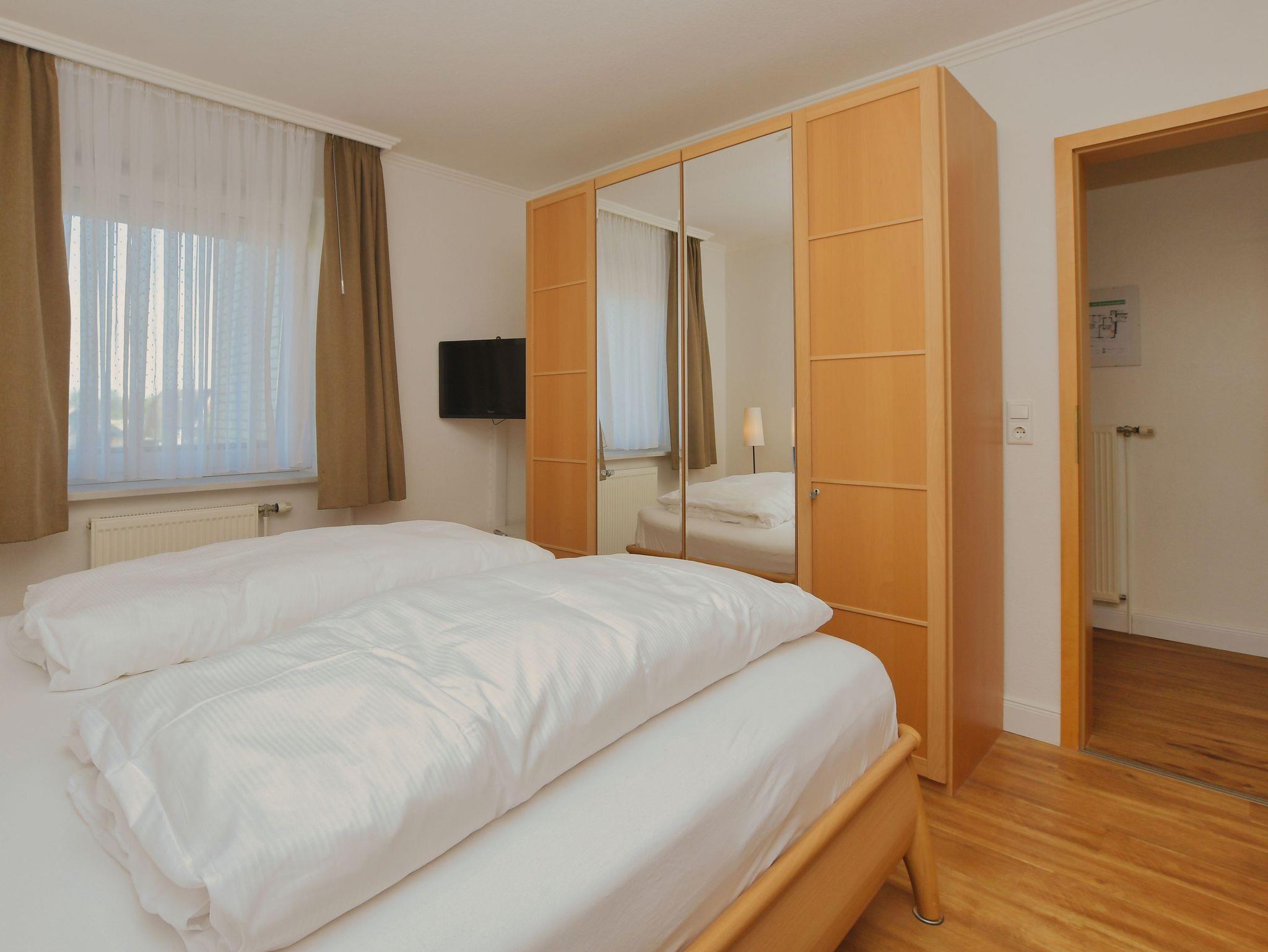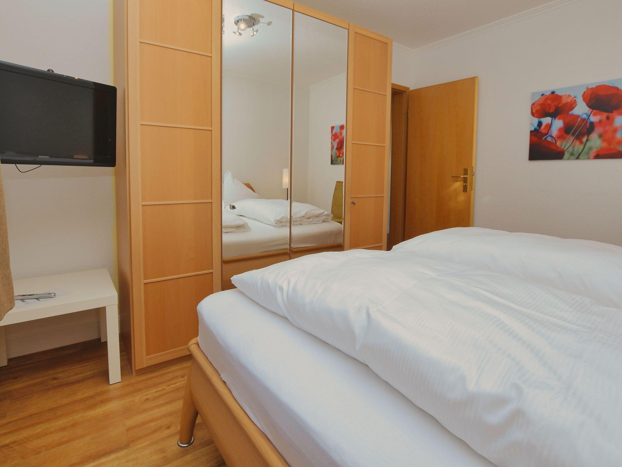 • Das Schlafzimmer mit Doppelbett ist ruhig gelegen zur Rückseite des Hauses. Es ist geräumig mit großem Kleiderschrank und einem Ganzkörperspiegel.