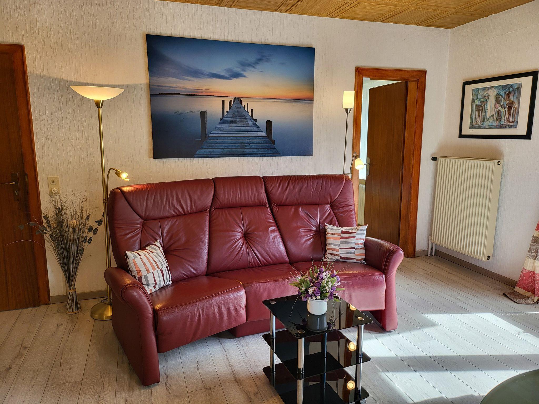 • Wohnzimmer mit gemütlicher Ledercouch (3 Sitze) und Couchtisch, großer Flachbildfernseher mit SAT-Anschluss, Stereoanlage mit CD, W-Lan, eine kleine Buchauswahl und Spiele zur Unterhaltung.