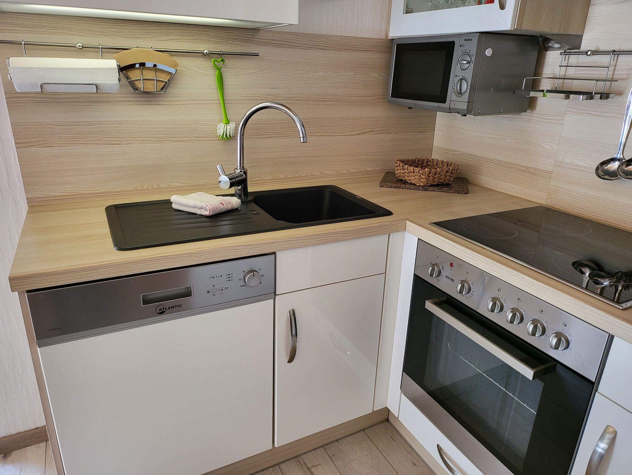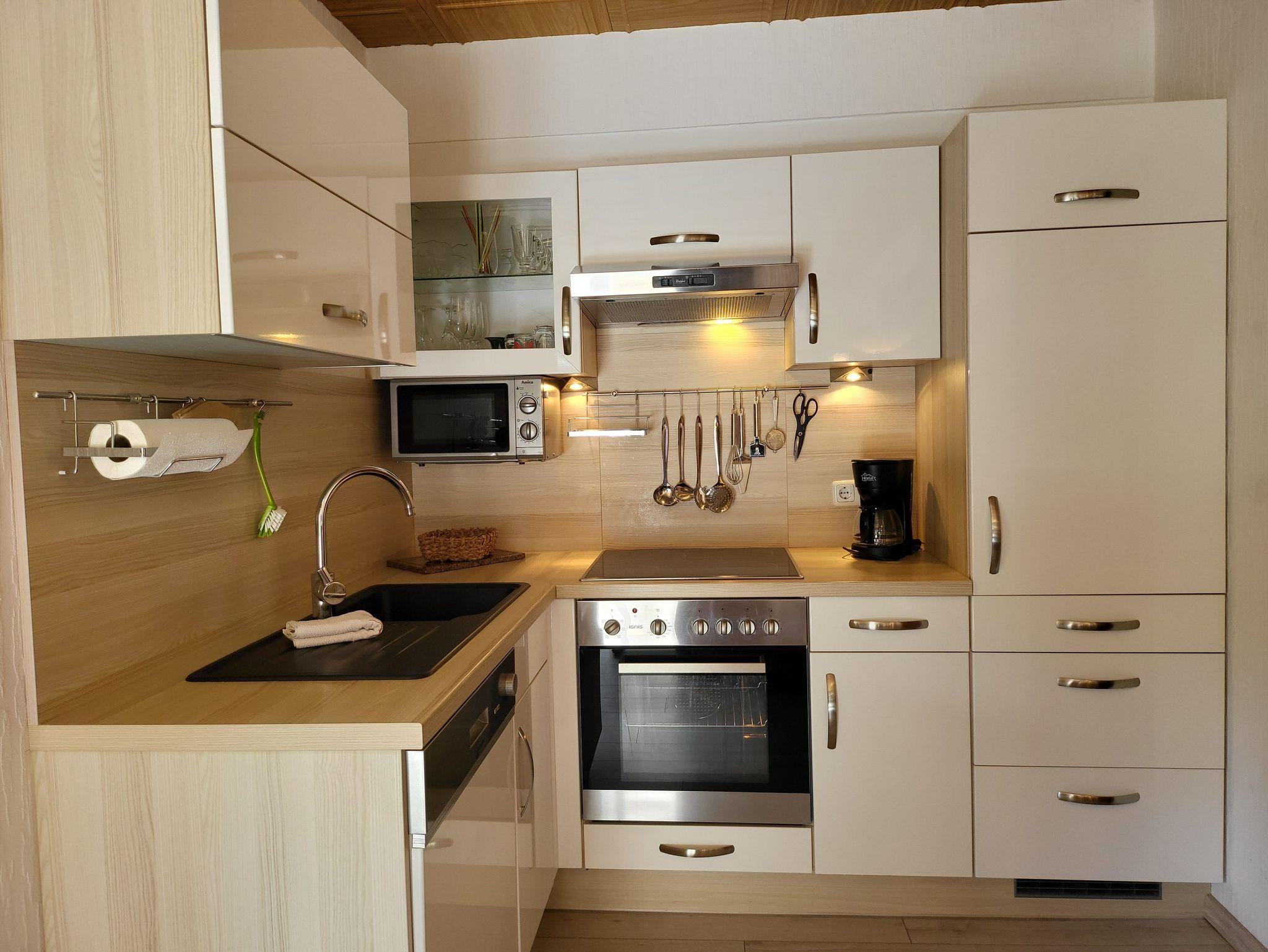 • Küchenzeile mit Herd und Backofen, Ceranfeld mit 4 Kochstellen, Dunstabzugshaube, Mikrowellengerät, Kühlschrank mit ***Gefrierfach. Geschirrspüler, Kaffeemaschine, Toaster und Wasserkocher. Ausreichend Geschirr und Hausrat sind selbstverständlich vorhanden.