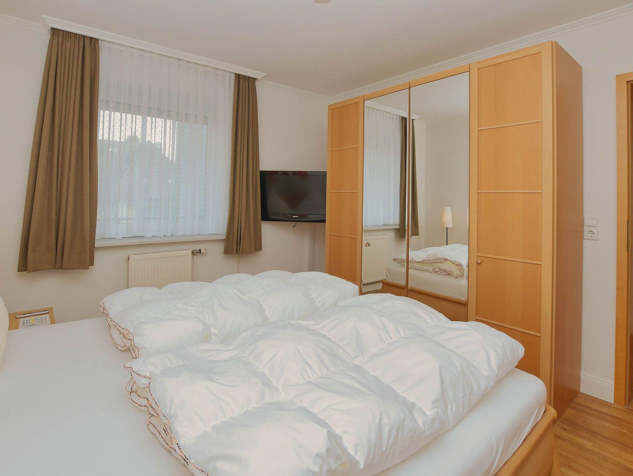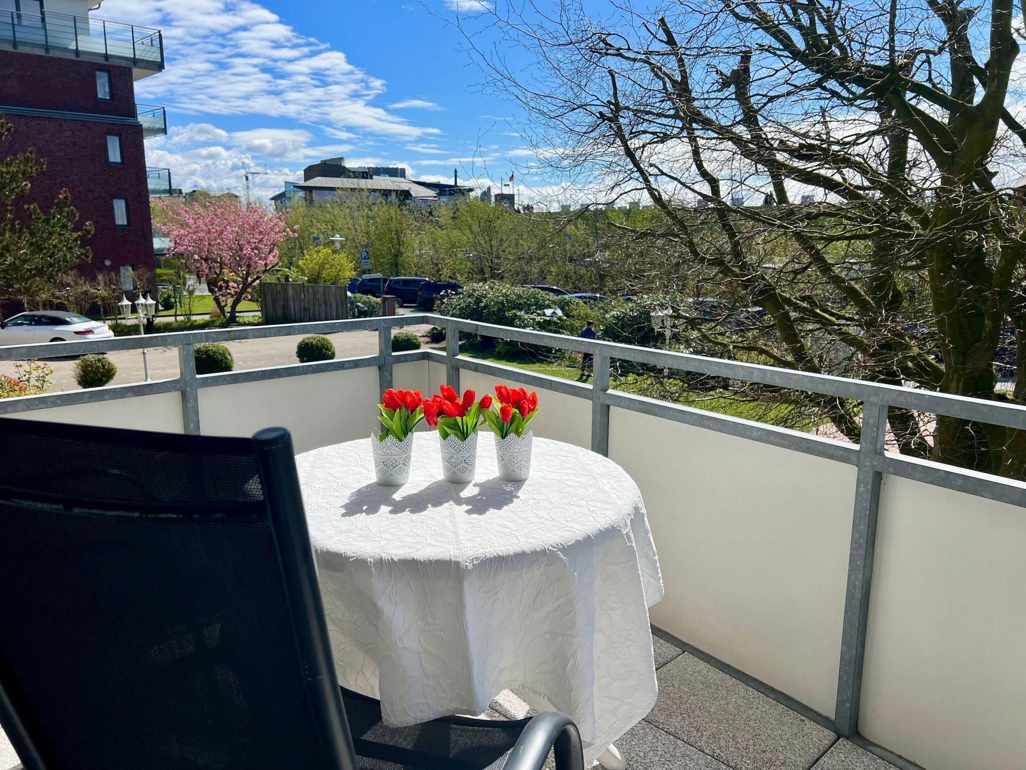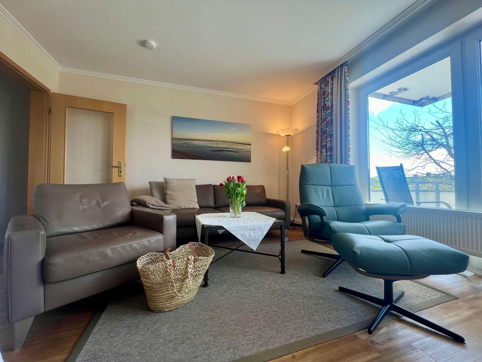 Appartement im Hochparterre mit Balkon. Das Schlafzimmer ist geräumig mit Doppelbett, großem Kleiderschrank und einem Ganzkörperspiegel. Wohnzimmer mit hochwertiger Schlafcouch, Sitzgruppe, Eßplatz und Küchenzeile.