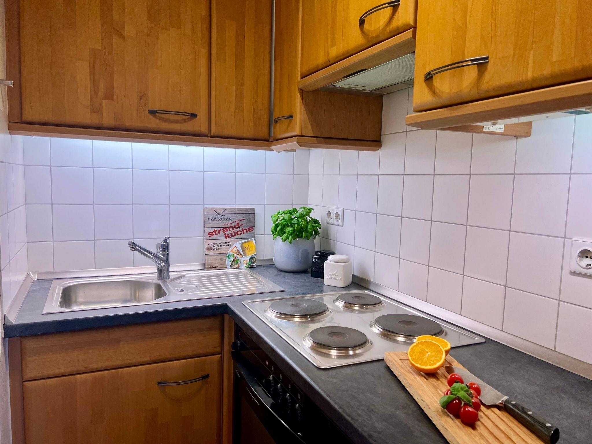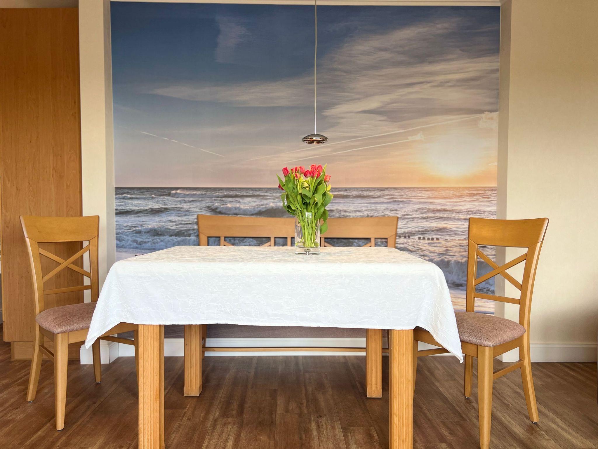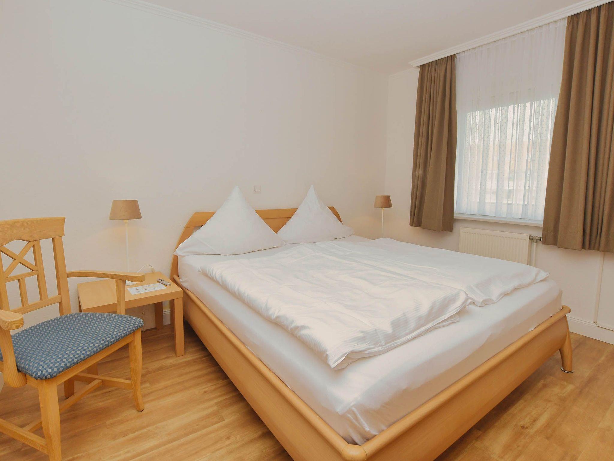 Appartement im Hochparterre mit Balkon. Das Schlafzimmer ist geräumig mit Doppelbett, großem Kleiderschrank und einem Ganzkörperspiegel. Wohnzimmer mit hochwertiger Schlafcouch, Sitzgruppe, Eßplatz und Küchenzeile.