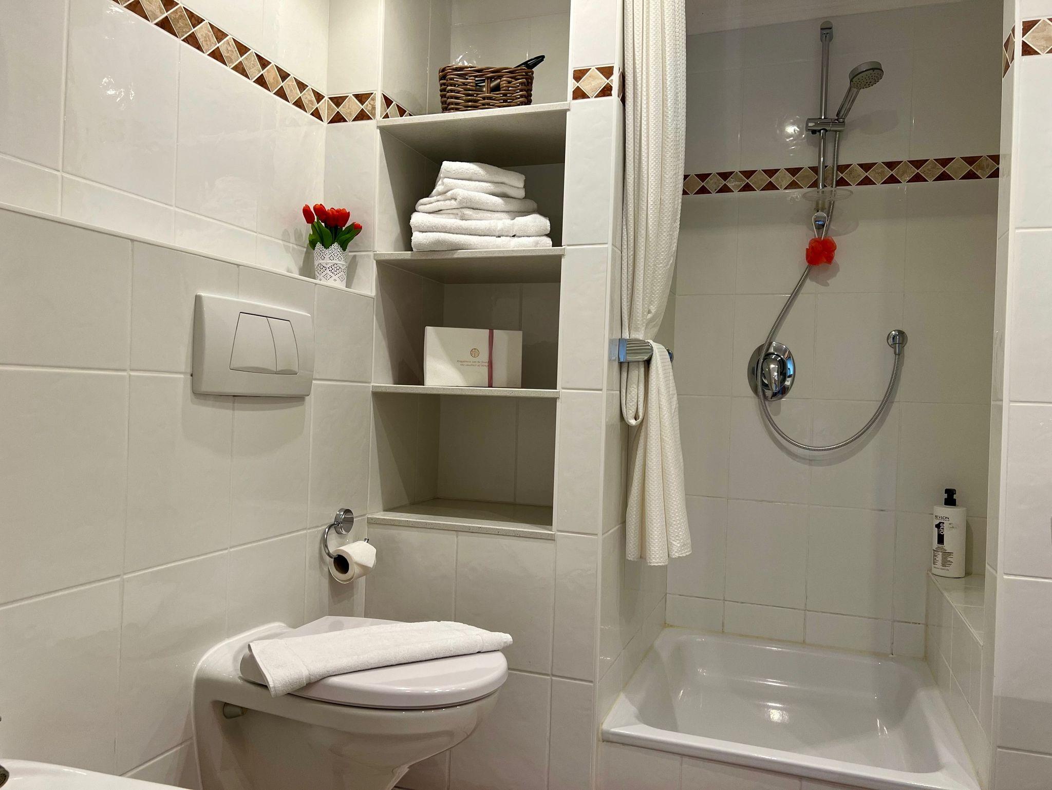 Dusche/WC, Bidet, großer Waschtisch mit Spiegel, ausreichend Ablageflächen, Fußbodenheizung, Handtuchtrockner und Radio.