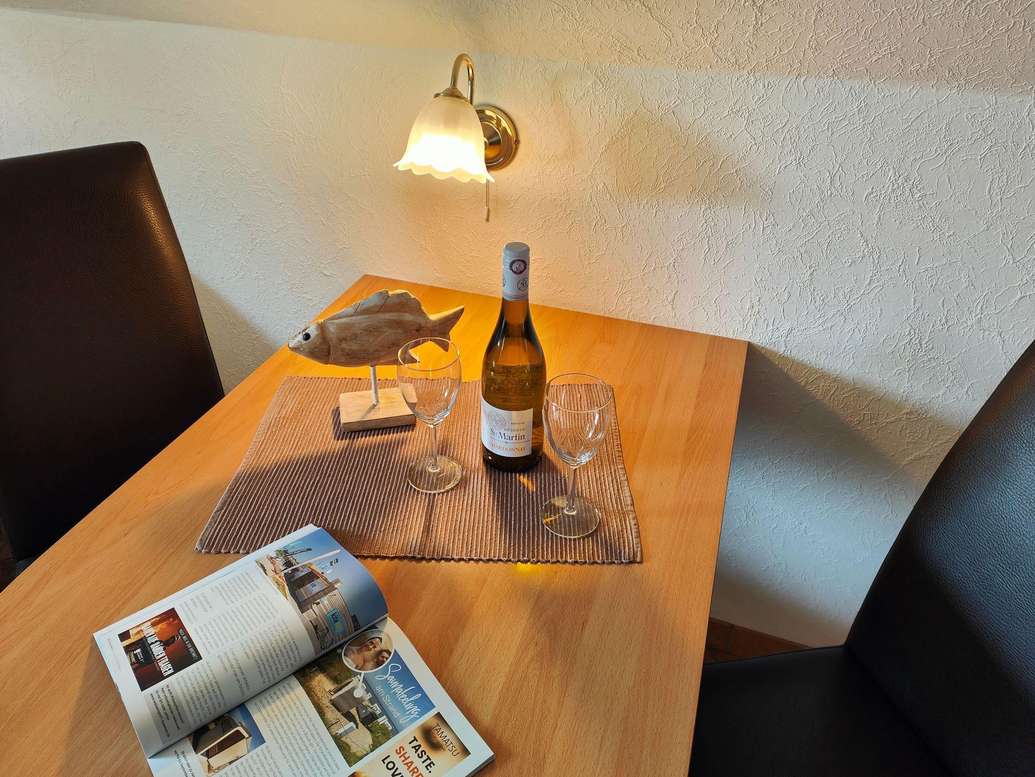 • Küchenzeile und Esstisch mit Stühlen, Ceranfeld mit 4 Kochstellen, Backofen, Spülmaschine, Kühlschrank mit 3Sterne-Gefrierfach, Mikrowelle, Kaffeemaschine, Wasserkocher, Toaster. Geschirr und Hausrat für den täglichen Bedarf ist vorhanden.