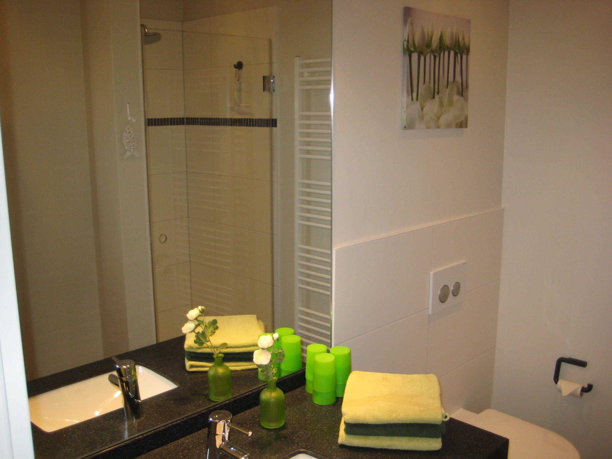 • Das modern eingerichtete Badezimmer verfügt über eine Dusche und WC. Ein Haartrockner ist vorhanden.