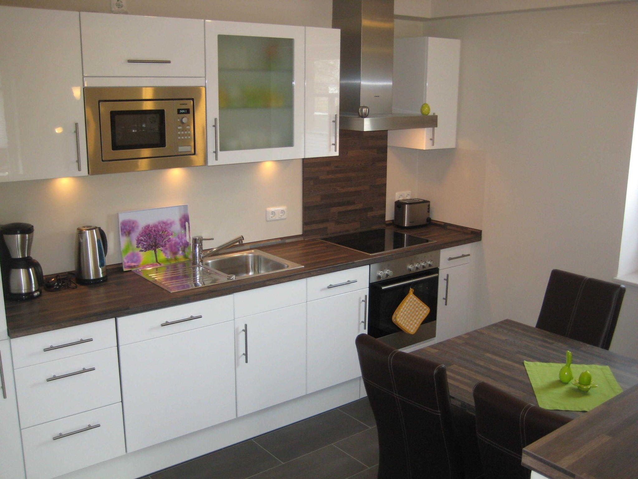 • Die modern und offen gestaltete Wohnküche mit integrierter Essgruppe verfügt über ein Cerankochfeld mit Backofen, Geschirrspülmaschine, Mikrowelle, Kühlschrank mit Tiefkühlfach, sowie Kaffeemaschine, Wasserkocher und Toaster.