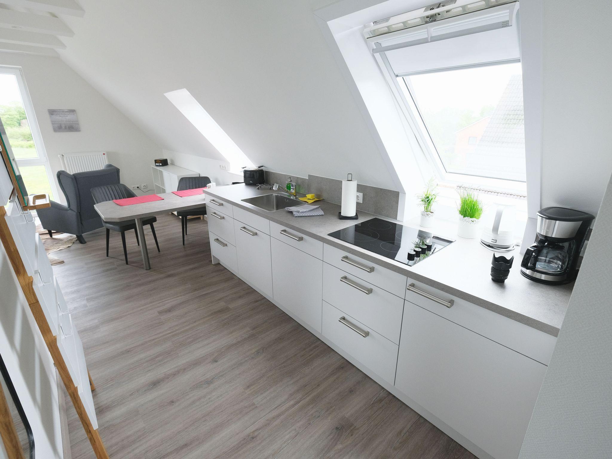 • Die neue Küchenzeile ist mit Ceranfeld (4-Kochstellen), Kühlschrank mit Gefrierfach, Geschirrspüler, Toaster, Kaffeemaschine, Wasserkocher und reichhaltig Geschirr ausgestattet.