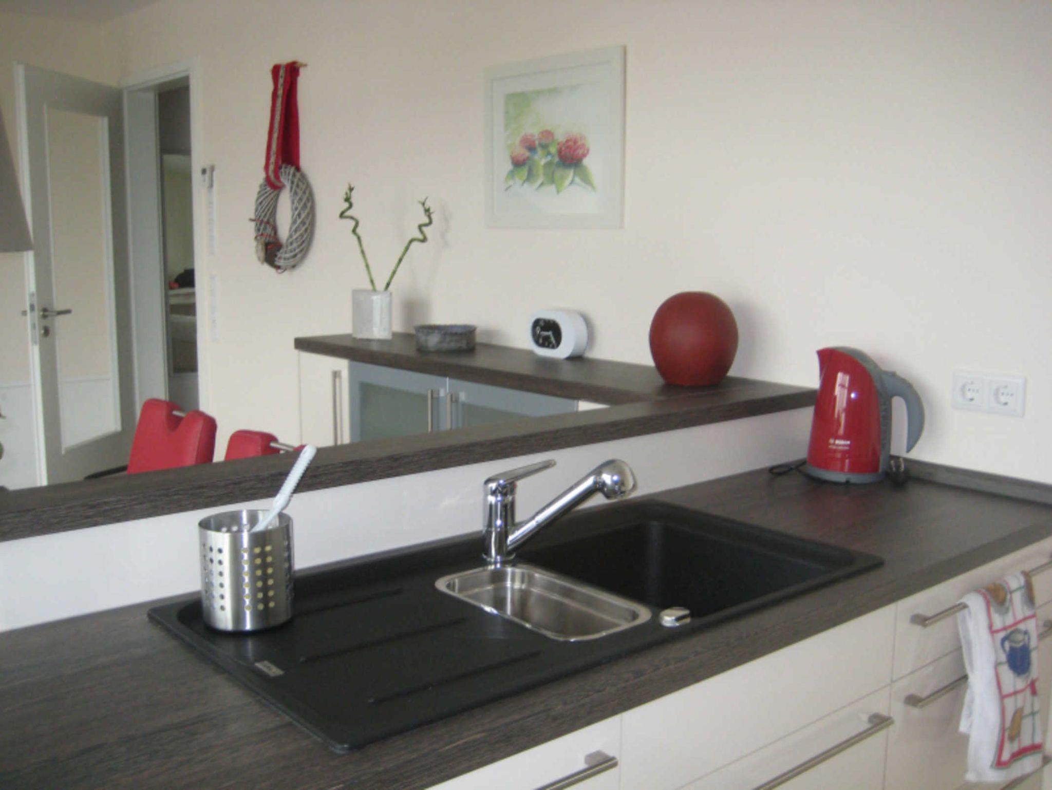 • Im Wohnzimmer integriert ist eine vollständig ausgestattete Küchenzeile. Sie verfügt über ein Induktionskochfeld mit Backofen, Mikrowellengerät, Geschirrspülmaschine, Kühlschrank mit Tiefkühlfach, sowie Kaffeemaschine, Wasserkocher und Toaster. Geschirr und Hausrat sind selbstverständlich ausreichend vorhanden.