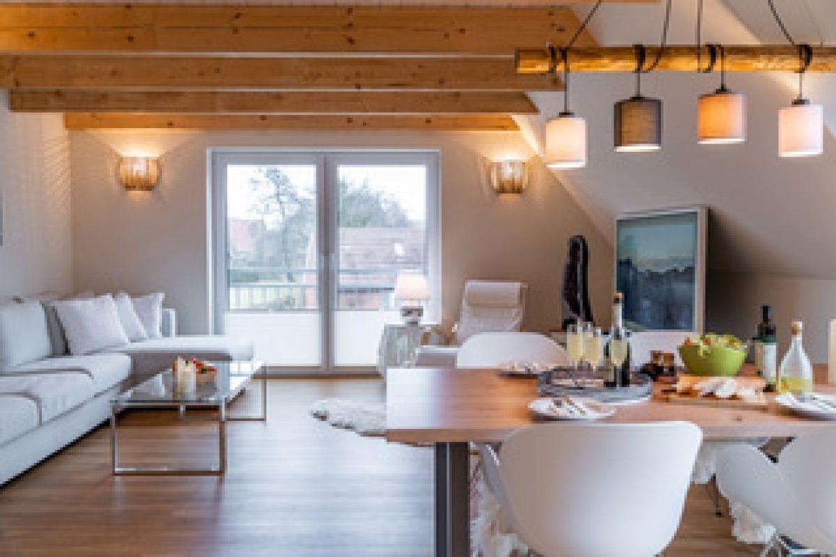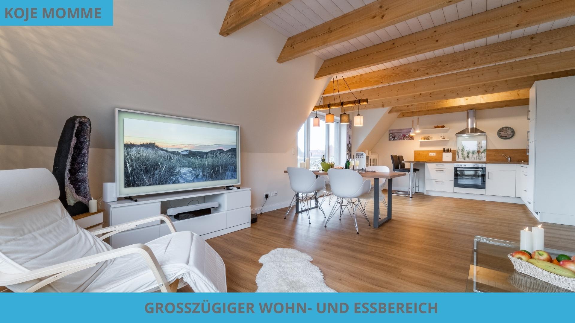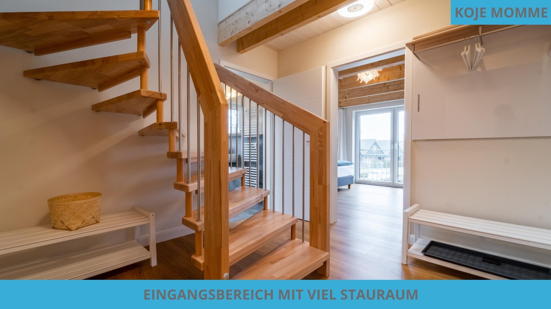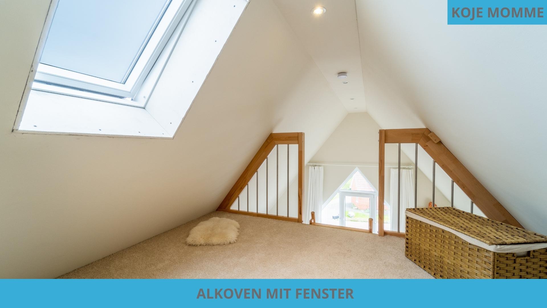 Momme steht für Gemütlichkeit, Leichtigkeit, frei sein und ankommen dürfen. Die Bodentiefe Fenster in der ganzen Wohnung sorgen für Weite und Größe und geben dir Raum, den Blick in die Ferne schweifen lassen zu können. Aus dem Doppelbett im Dachgeschoss kannst du sogar den Sonnenaufgang aus dem Bett genießen. Der Alkoven bietet Platz zum spielen und für kuschelige und behütete Nächte.