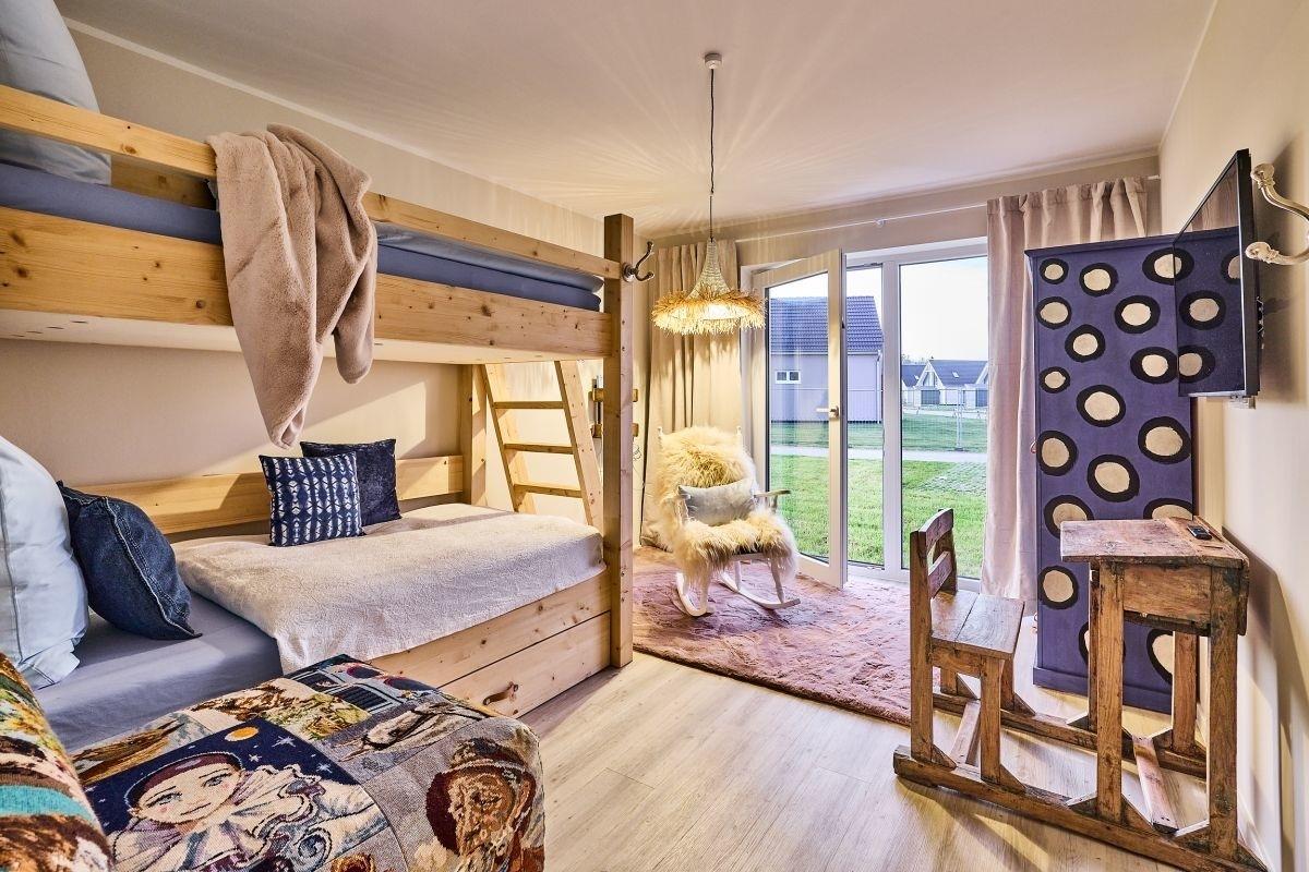 Design zum Wohlfühlen findet hier die ganze Familie. Zwei getrennte Schlafzimmer versprechen einen entspannten Schlaf. Das großzügige Familiensofa lädt zum Kuscheln am Kamin oder zum Entspannen nach dem Saunagang ein.