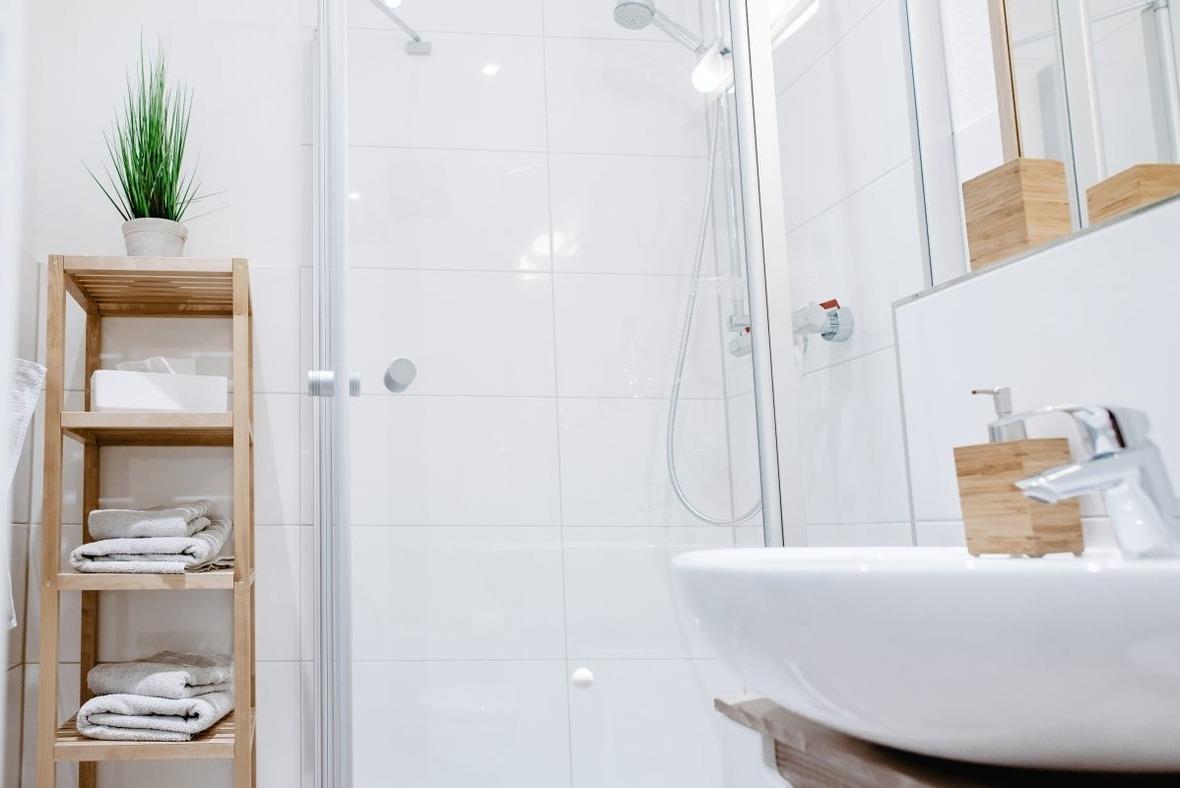 Ein Badezimmer mit Dusche, WC und Handtuchwärmer rundet diese schöne Wohnung ab.