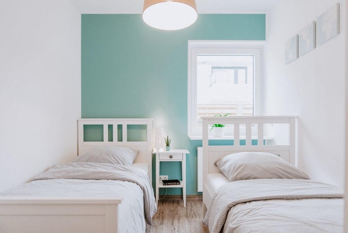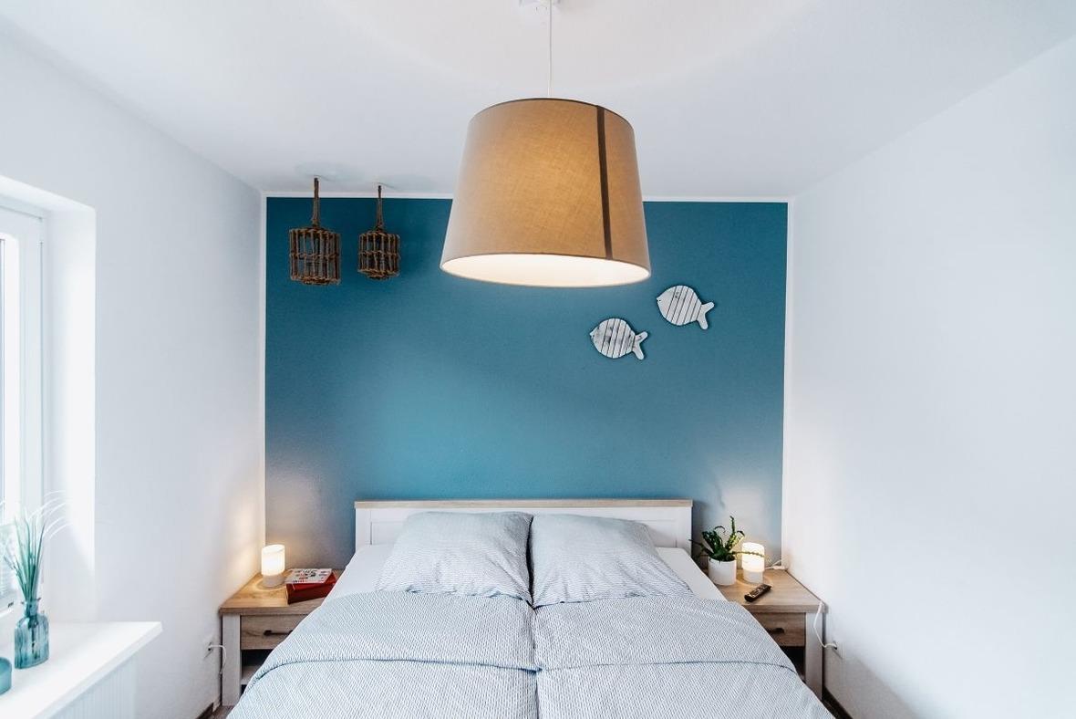 Eines der beiden Schlafzimmer ist mit einem Doppelbett (180x200, 2 Matratzen), Kleiderschrank und TV- Gerät eingerichtet. Das zweite Schlafzimmer ist mit 2 Einzelbetten und einem Kleiderschrank möbliert.