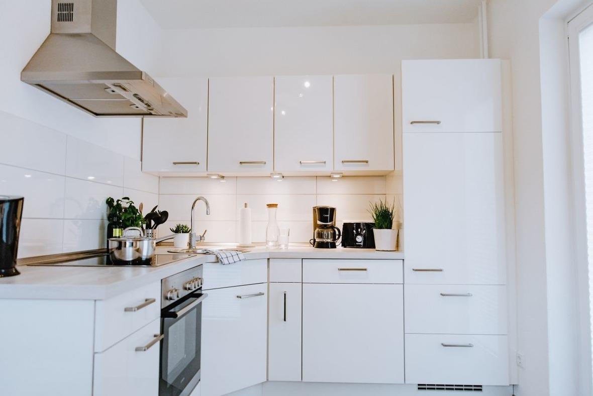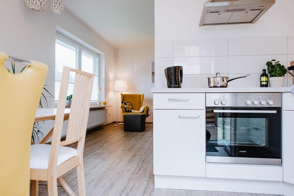 Die hochwertige Küchenzeile im Wohnbereich ist mit Backofen, Geschirrspülmaschine und allen nötigen Küchenutensilien komplett ausgestattet. Um ihre Mahlzeiten einzunehmen können Sie an dem Esstisch in dem Raum Platz nehmen.