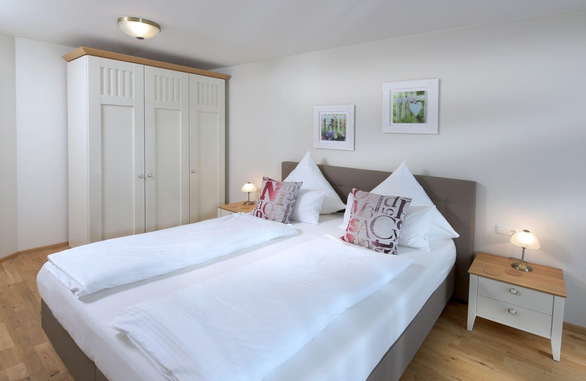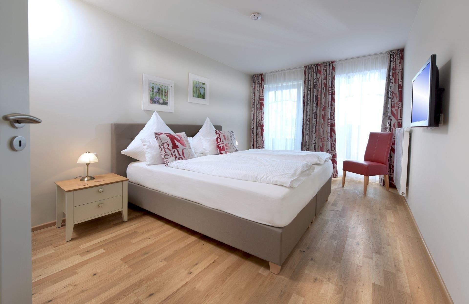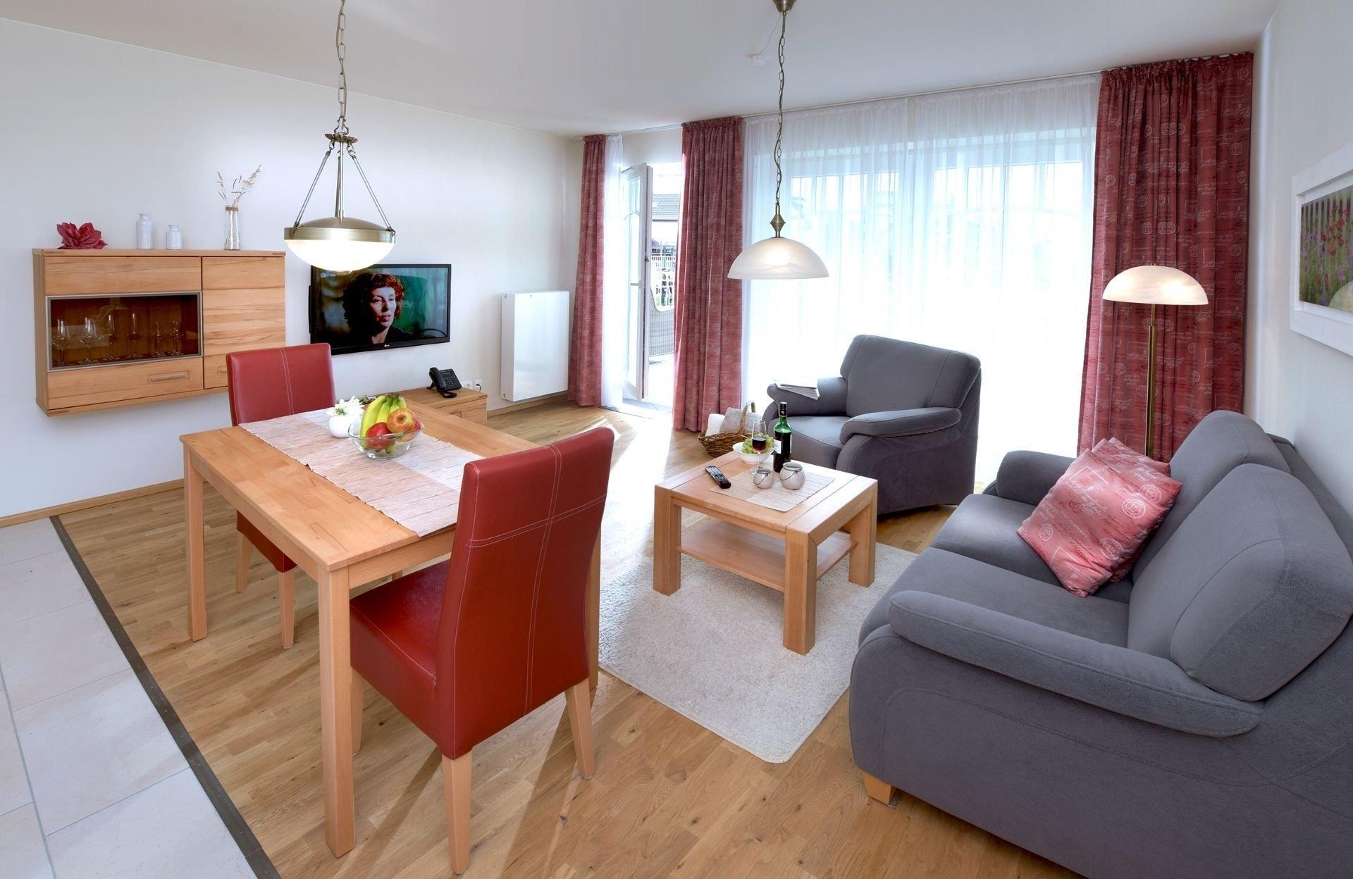 Diese Ferienwohnung liegt im ersten Stock unseres Hauses und ist ideal für zwei Personen. Die großen Fenster in Südausrichtung gewähren lichtdurchflutete Räume und eine schöne Aussicht. Holzfußböden im kombinierten Wohn- und Esszimmer sowie im Schlafzimmer und eine hochwertige Schallisolierung sorgen für eine angenehme und erholsame Atmosphäre. Besonderen Komfort bieten wir mit einer hochwertigen Ausstattung der Ferienwohnung und stufenfreien Zugängen mittels Aufzug und Walk-In-Dusche im Bad. Auf der großen Hochterrasse können Sie auf bequemen Lounge-Möbeln bei schönem Wetter bis in die frühen Abendstunden die Sonne genießen. Sie werden sich zu jeder Jahreszeit und bei jedem Wetter bei uns wohl fühlen.