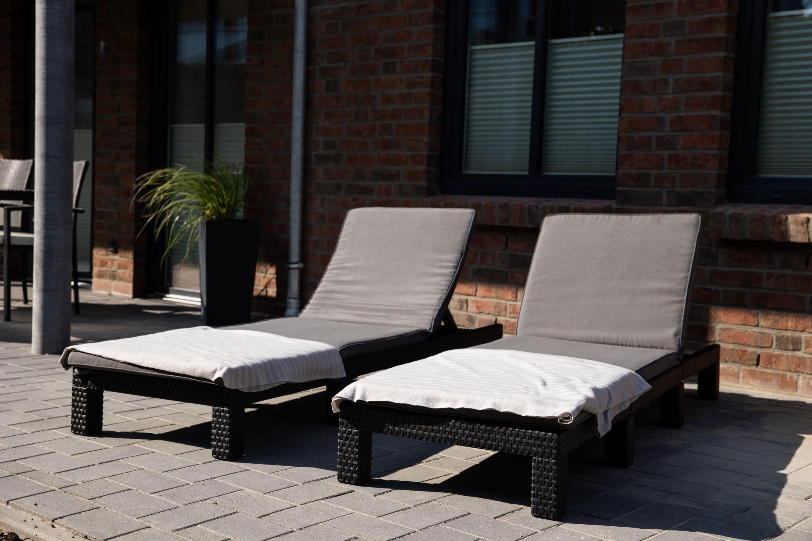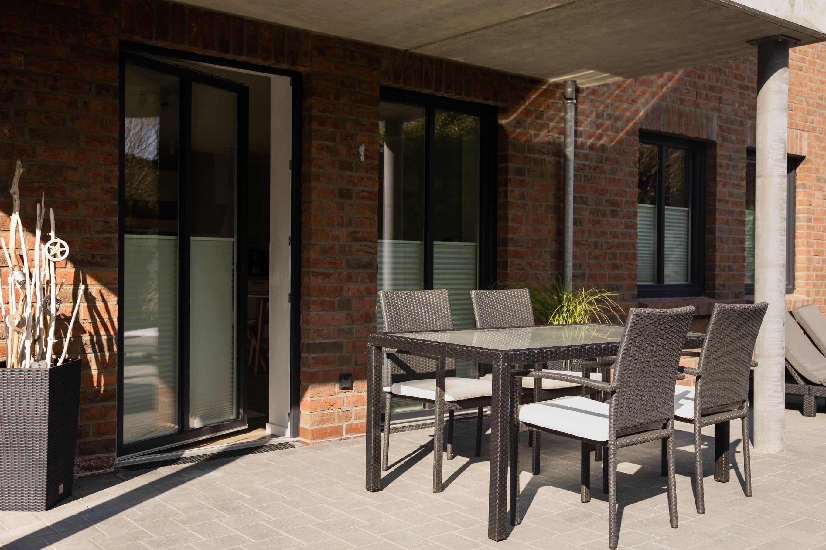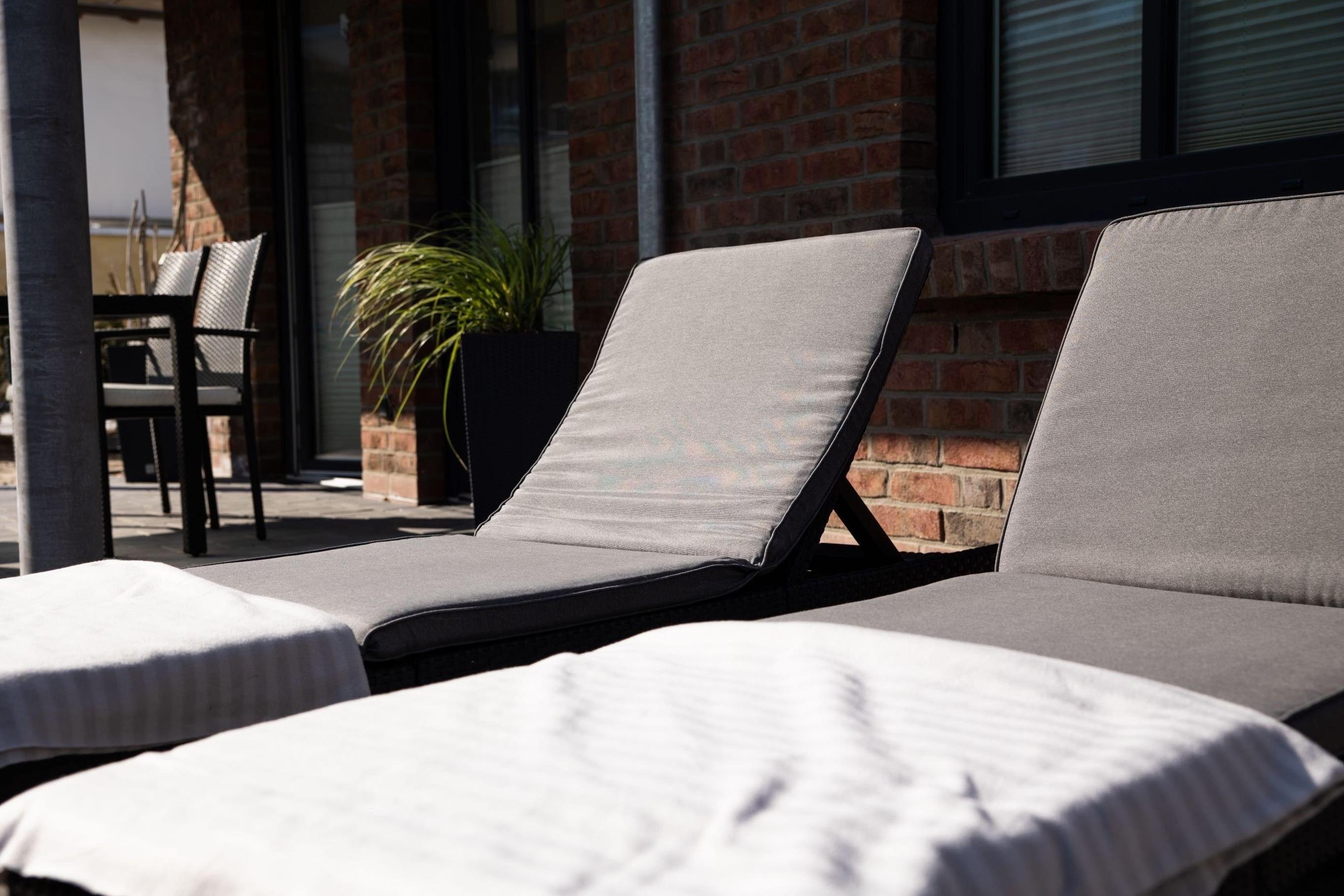 Die großzügige Terrasse bietet mit 27 m² viel Platz und die Möglichkeit zum Grillen. Die Terrasse ist mit zwei Sonnenliegen sowie einer Sitzgarnitur ausgestattet. Durch die Lage der Wohnung zum Hinterhof ist hier viel Privatsphäre gewährleistet.