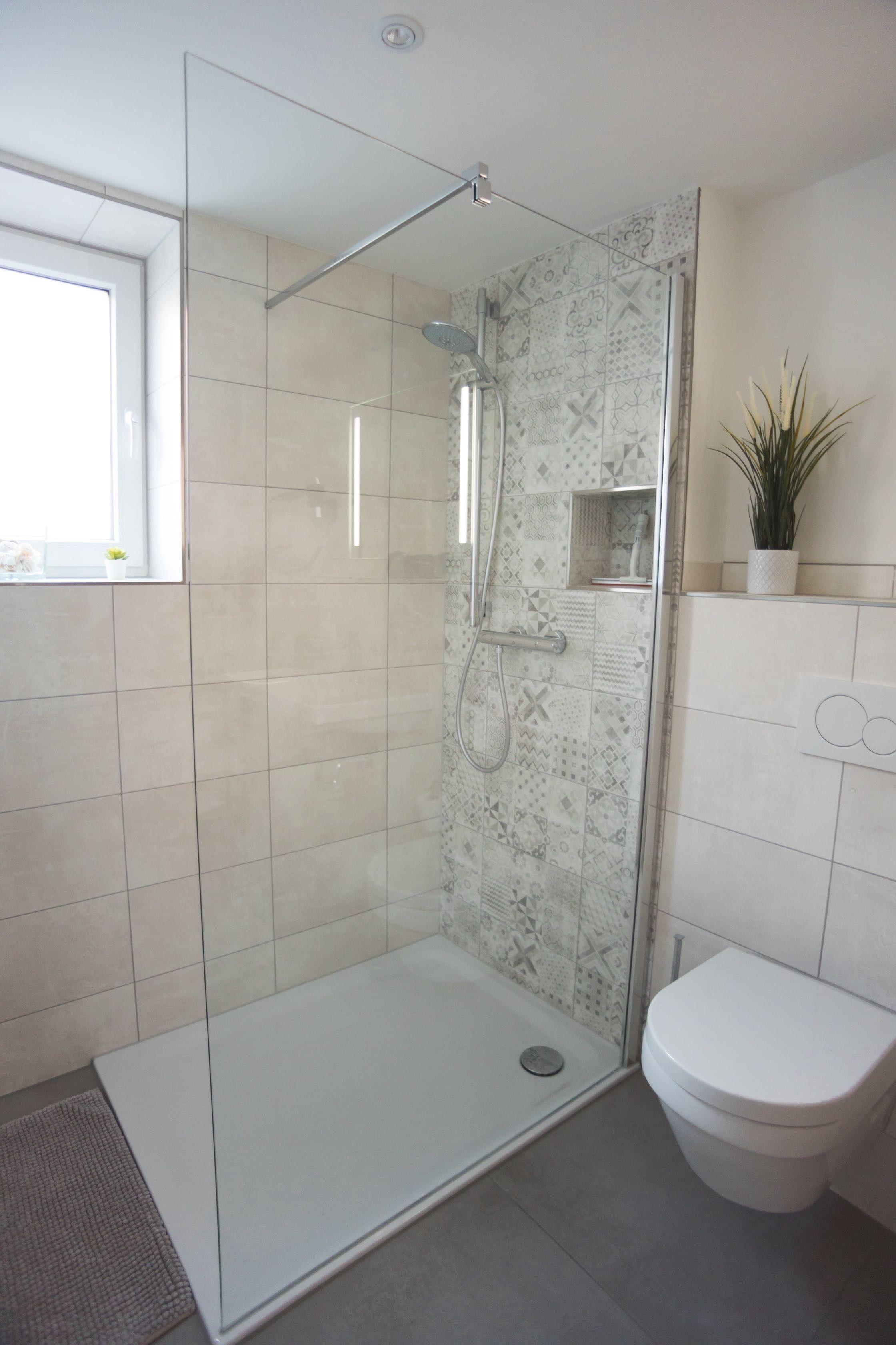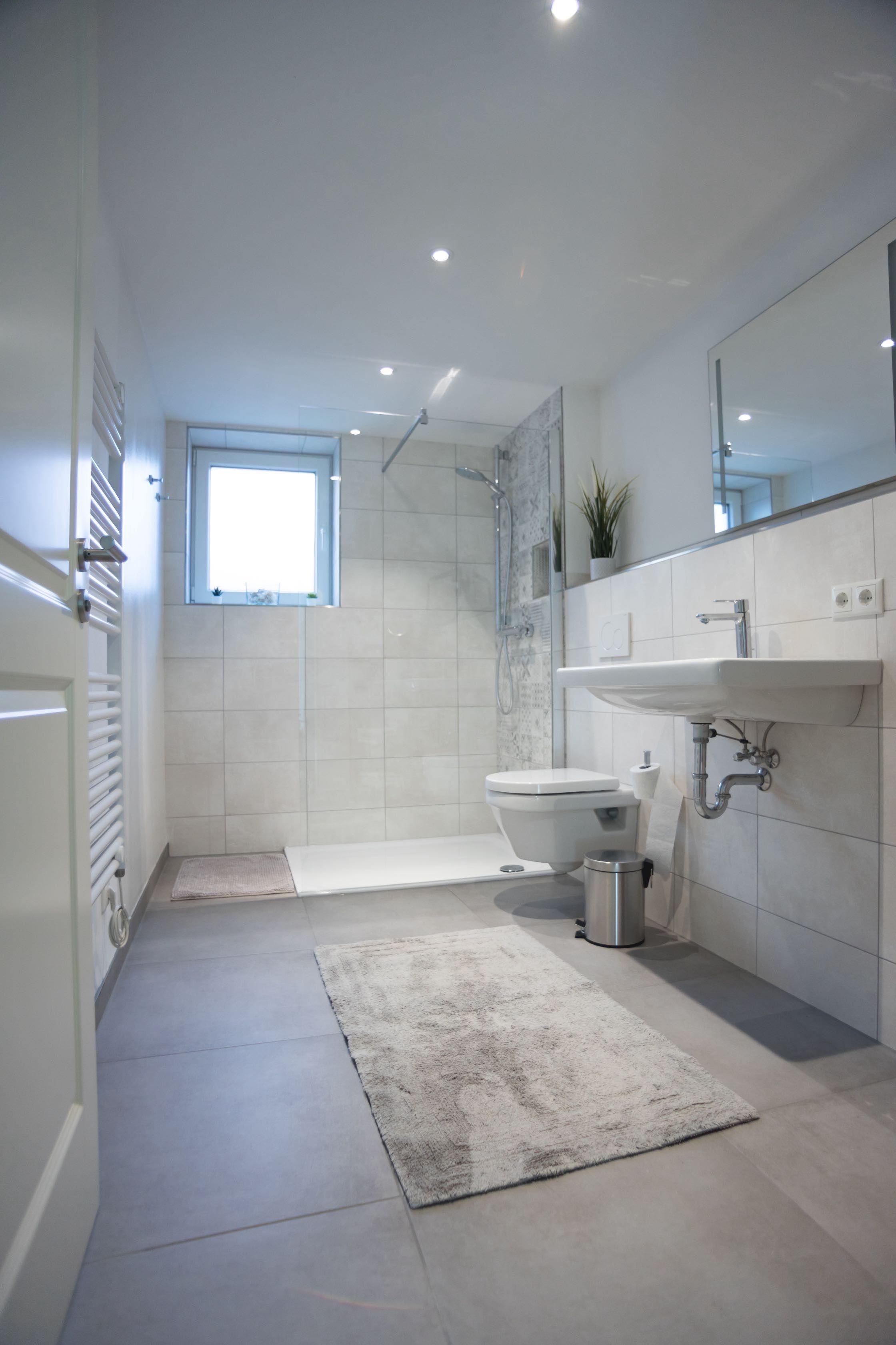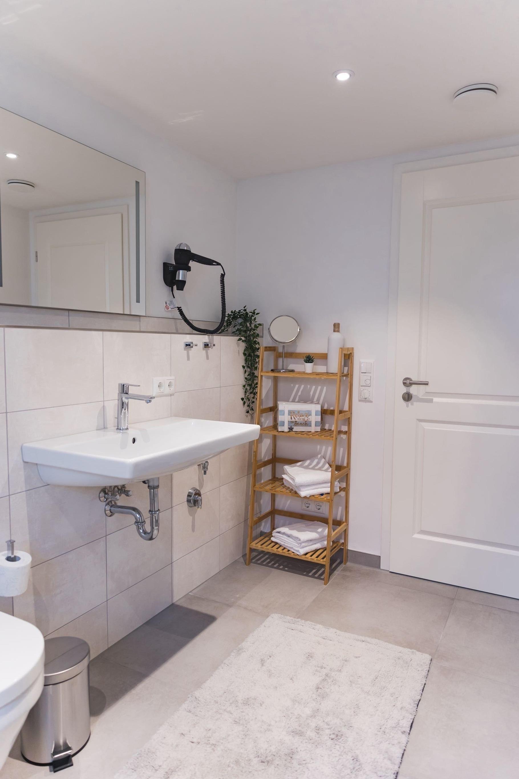 Das Highlight des Badezimmers ist die bodenebene Dusche, die durch die schönen Mosaik-Fliesen zum Hingucker wird.