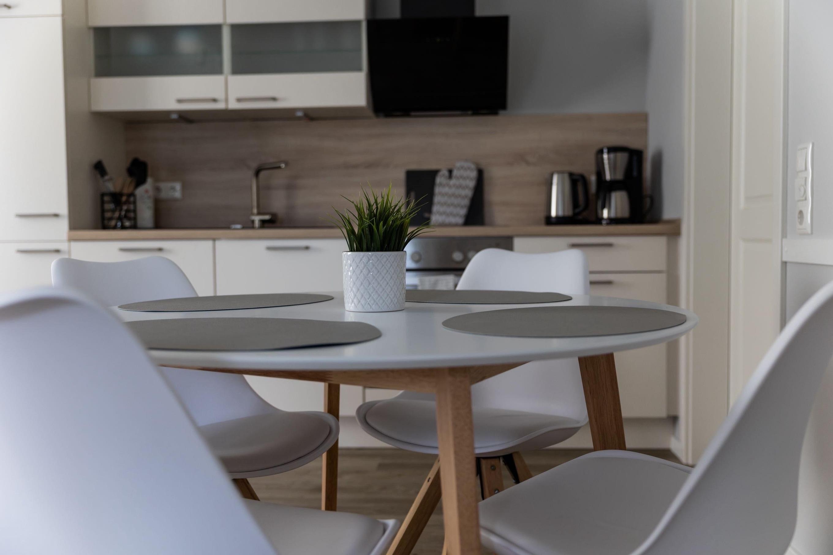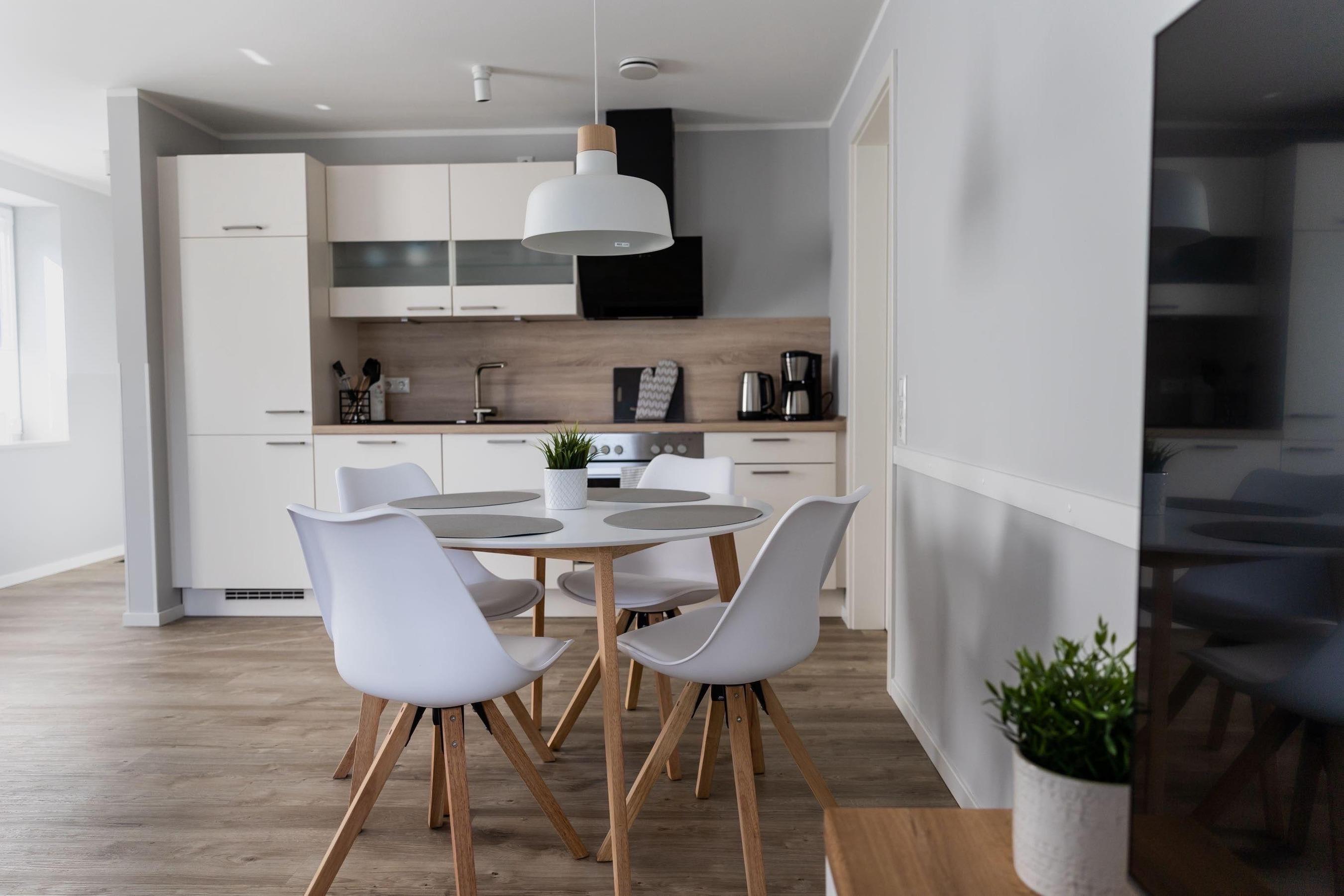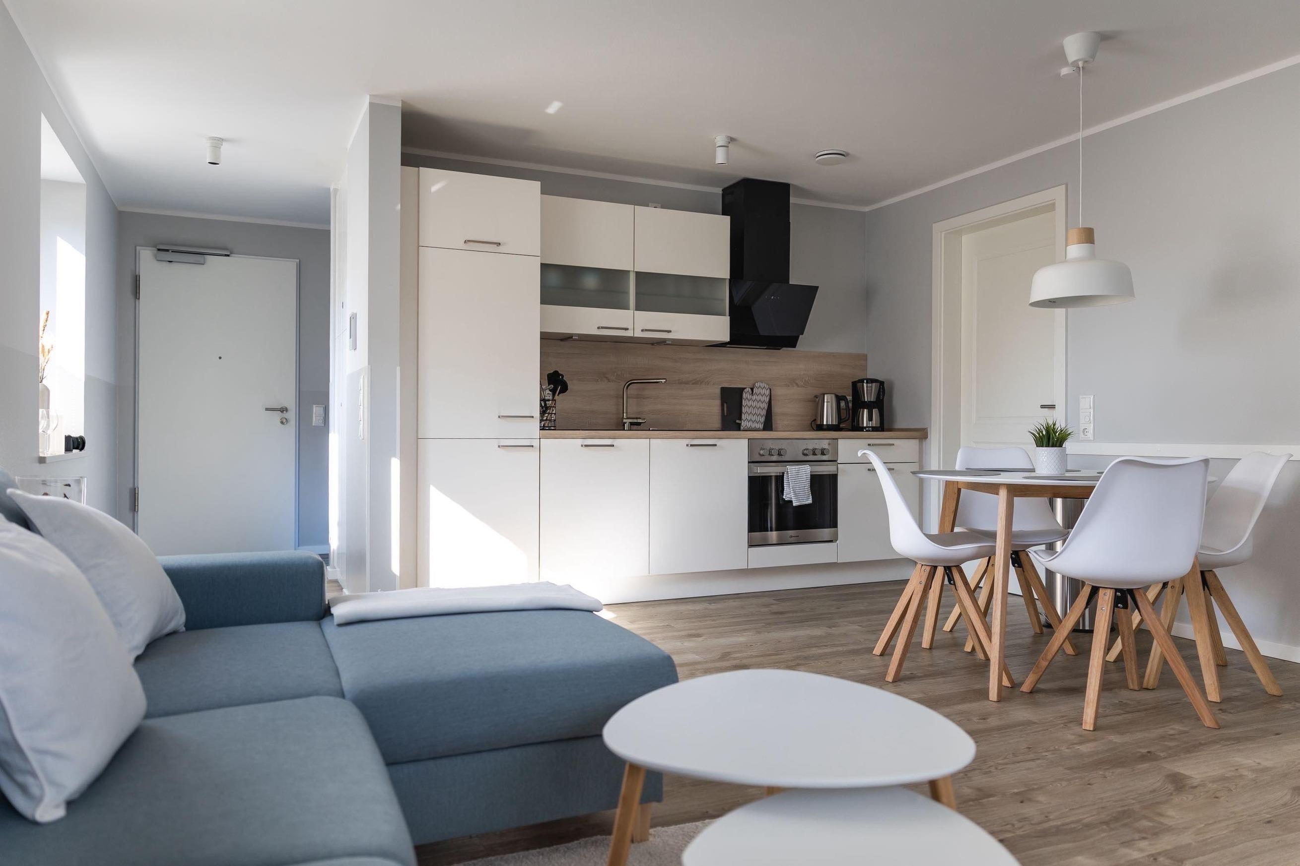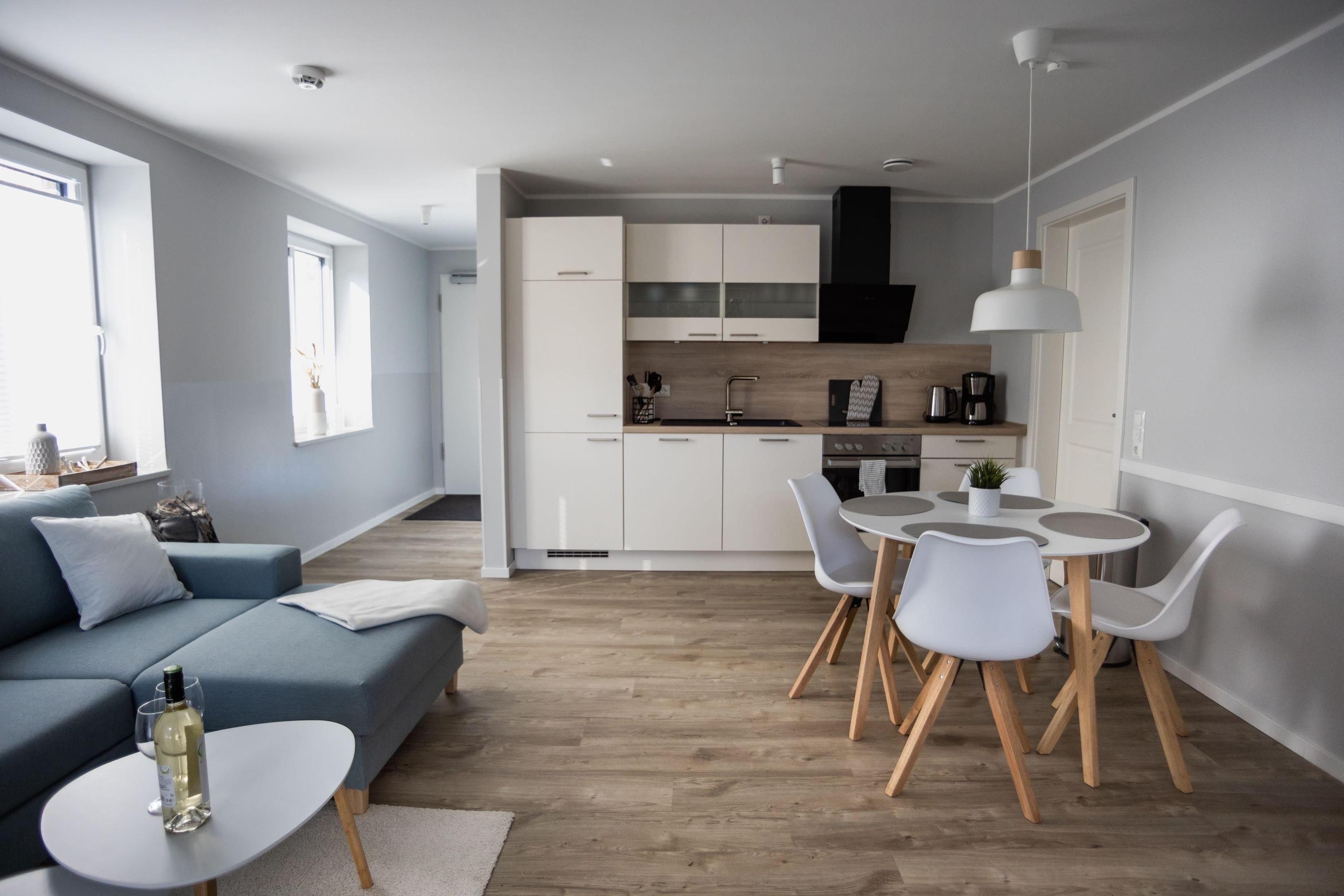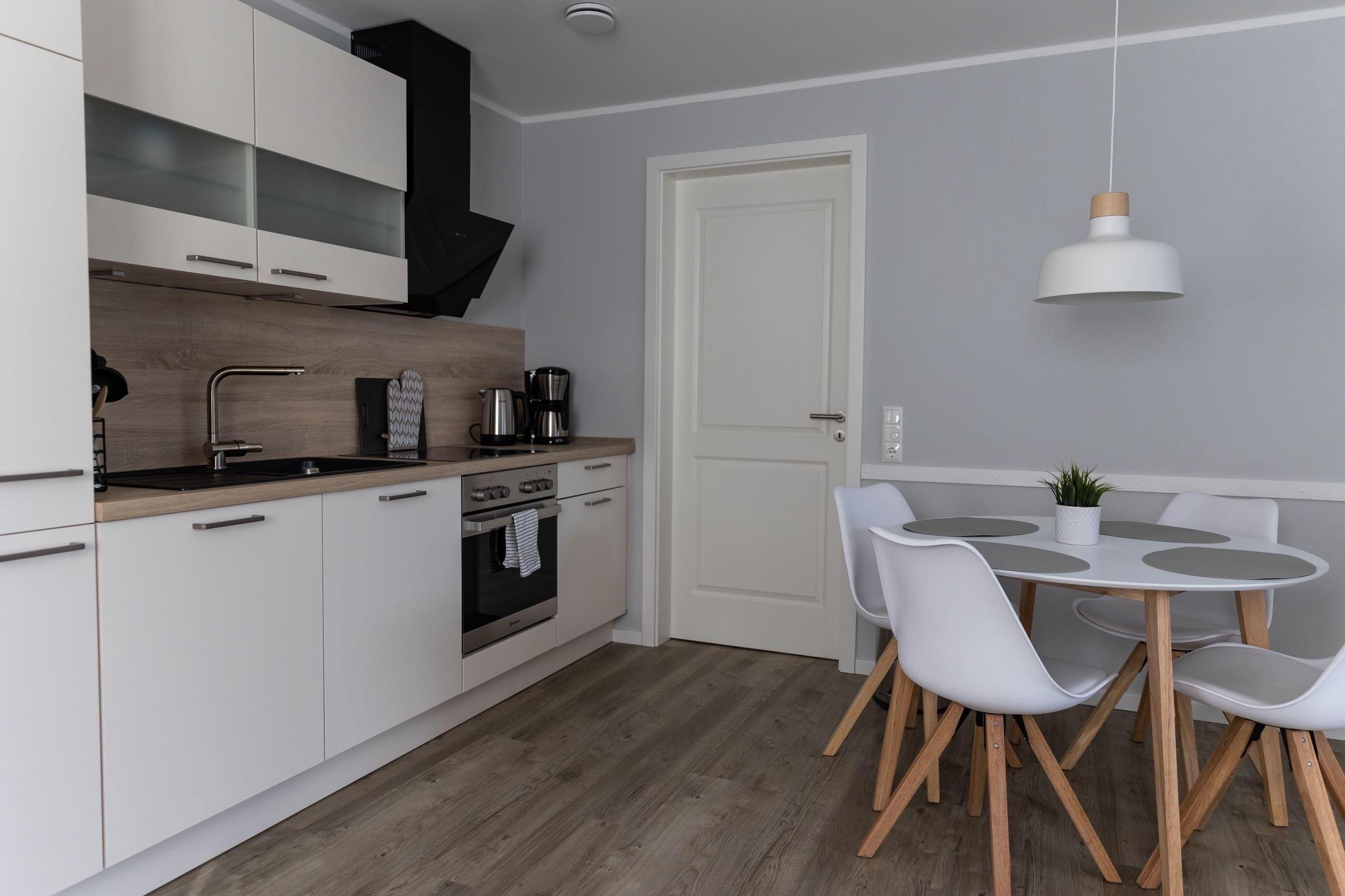 Das nordische, schlichte Design setzt sich auch in der offenen Küche fort. Sie verfügt über eine vollwertige Ausstattung mit hochwertigen Küchengeräten inklusive Geschirrspülmaschine. Das Kücheninventar beinhaltet Kleingeräte wie eine Kaffeemaschine, Wasserkocher und Toaster sowie sämtliche Utensilien zum Kochen.