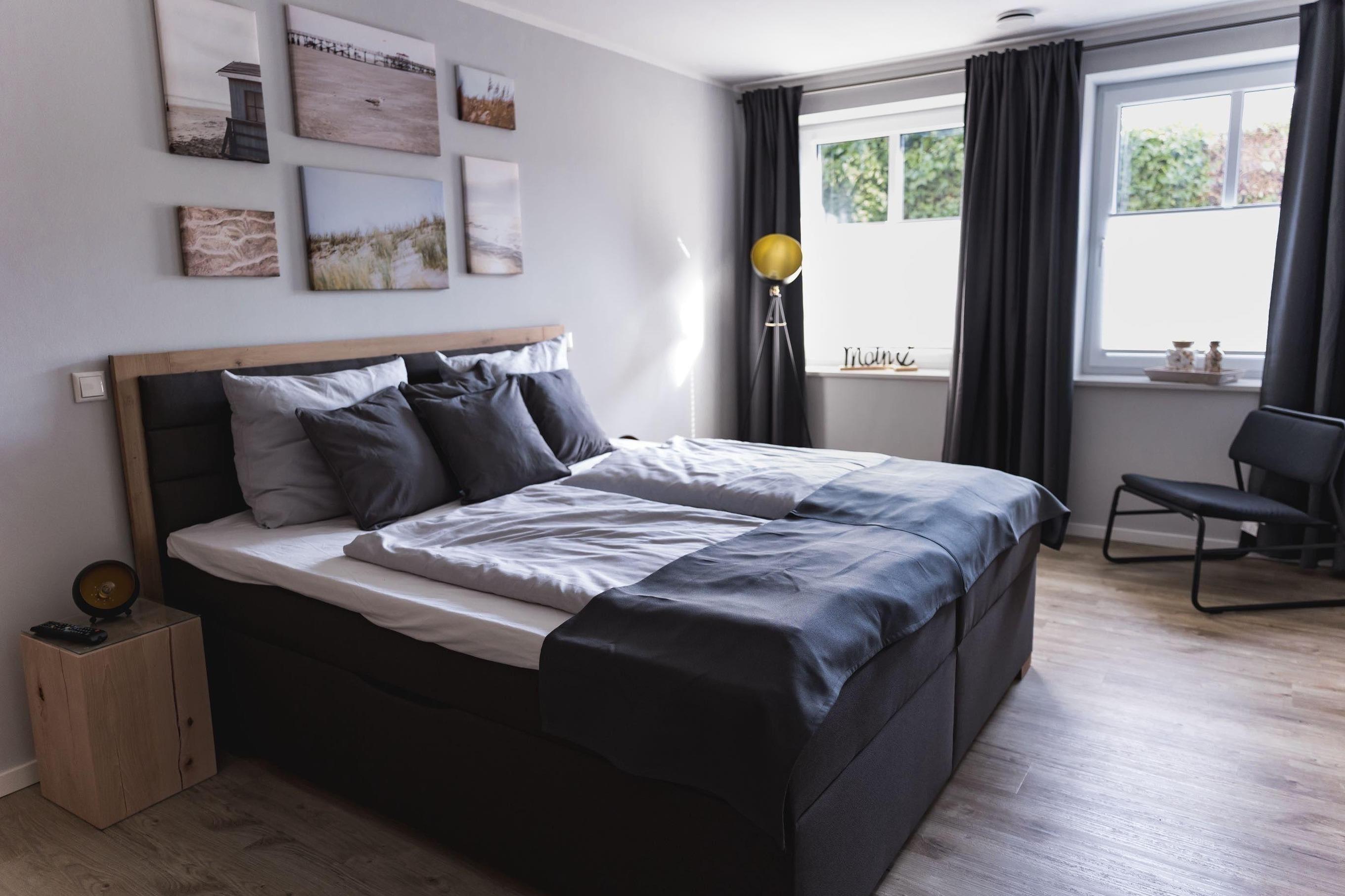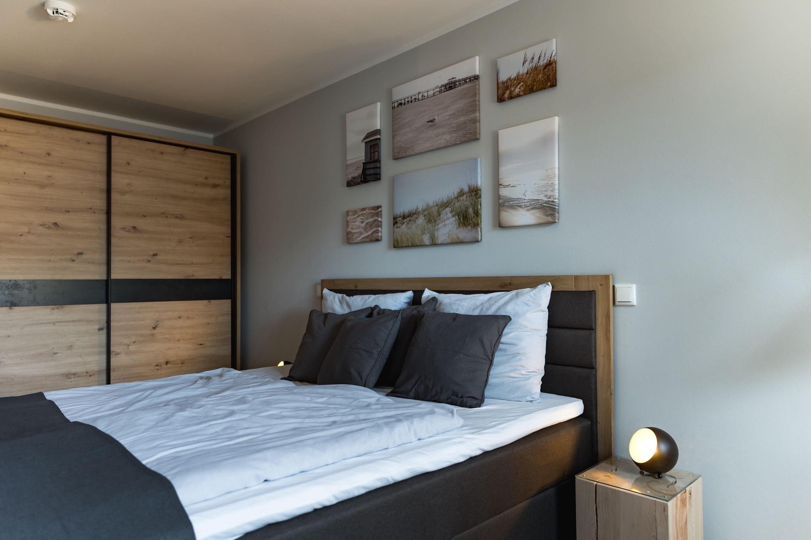 Das Schlafzimmer ist mit einem großen Boxspringbett sowie einem Smart TV mit Zugriff auf gängige Streaming-Dienste ausgestattet. Außerdem bietet der große Kleiderschrank viel Stauraum.