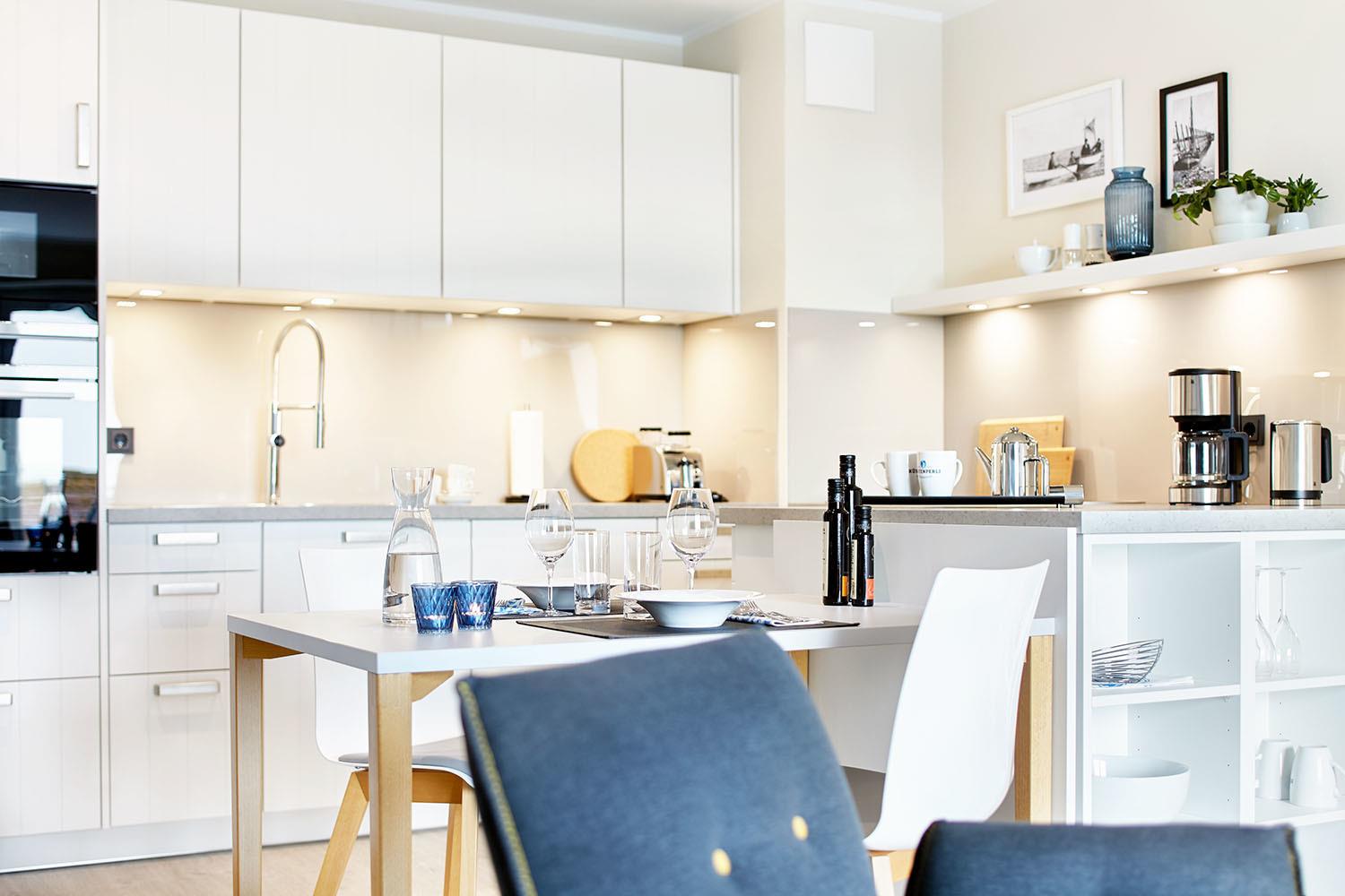 Die zwischen 62 und 84,5 m² großen Ferienwohnungen bieten Platz für 2 bis 4 Personen mit einem oder zwei Schlafzimmern. Herzstück ist jeweils ein großzügiger Wohnraum mit Wohnzimmer und offener Küche sowie einem gemütlichen Essbereich. Auf Balkon oder Terrasse können Sie die frische Seeluft mit und ohne Meerblick genießen.