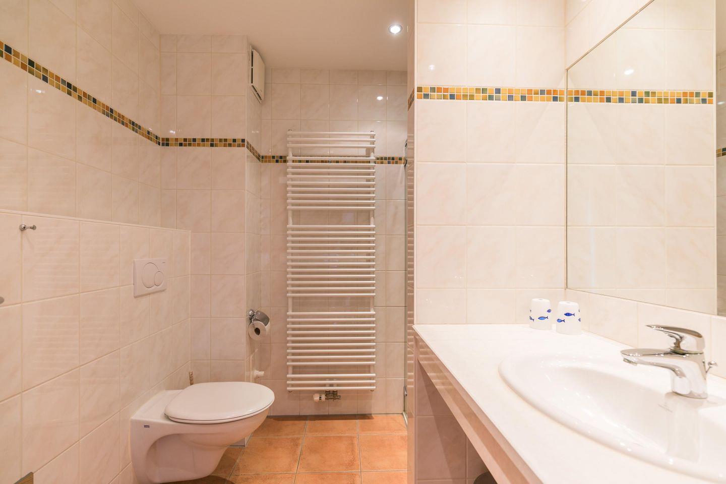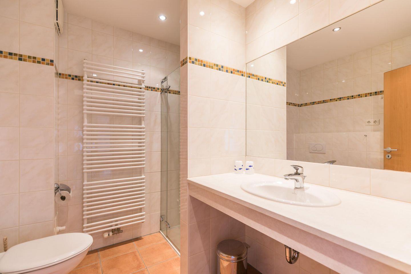 Dusche ebenerdig, WC, Waschbecken, Handtuchwärmer, Föhn, Abluft, Spiegel, Hocker