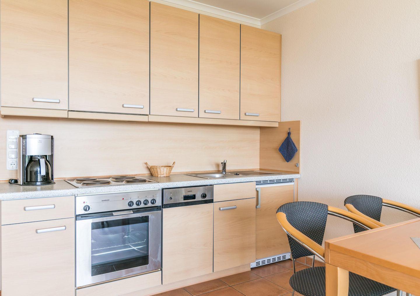 Einbauküchenzeile, Herd mit Backofen, Geschirrspüler, Kühlschrank mit Gefrierfach, Kaffeemaschine, Toaster, Wasserkocher, Eierkocher