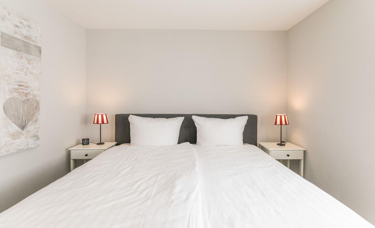 1 Boxspringdoppelbett mit durchgehender Matratze (1,80x2,00m), 1 Einzelbett, Nachtschränke, Kleiderschrank, Fenster mit elektrischen Außenjalousien, Flachbild-TV