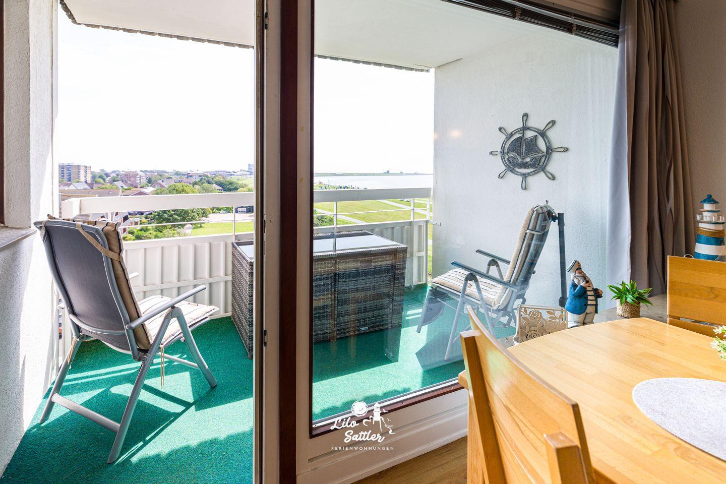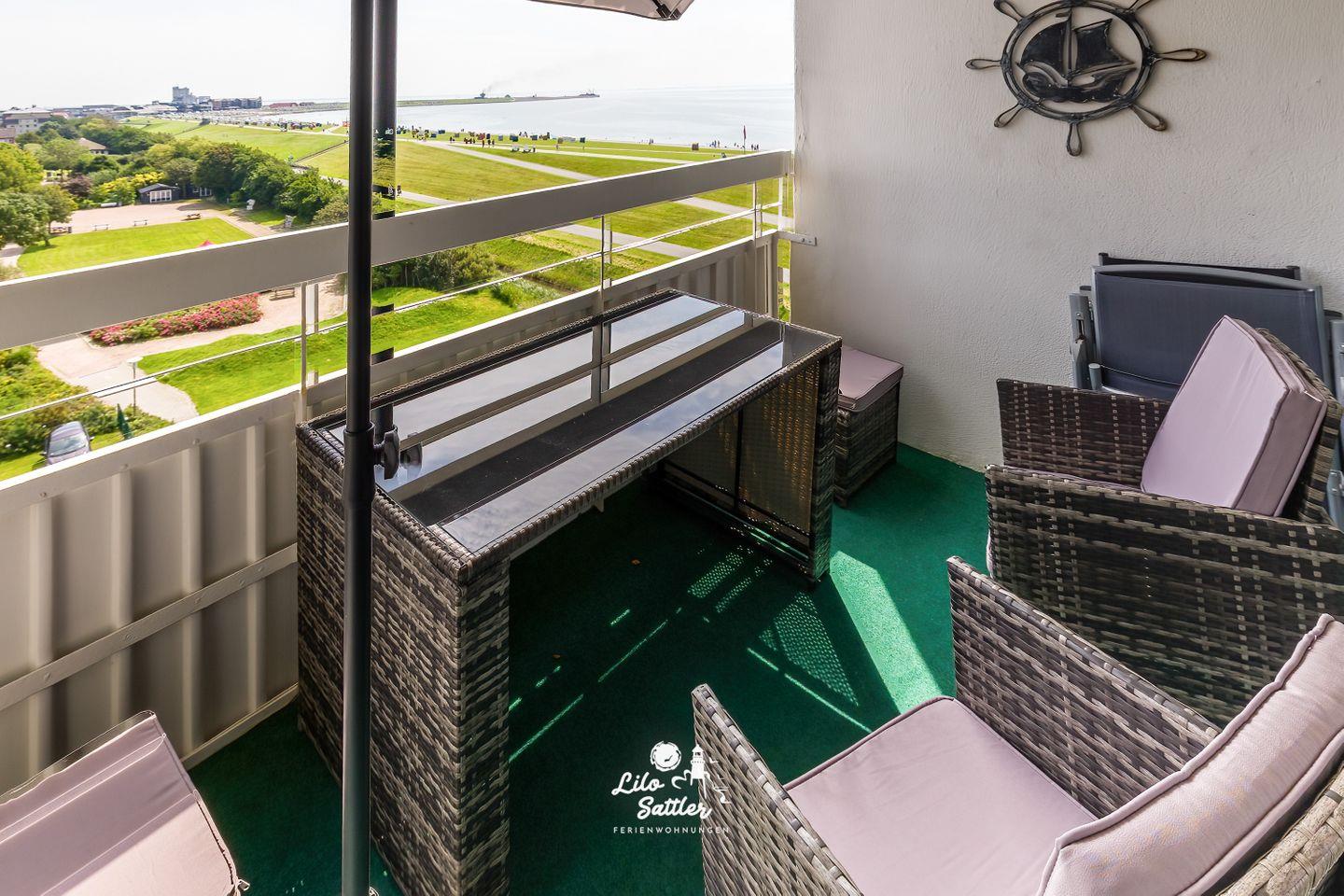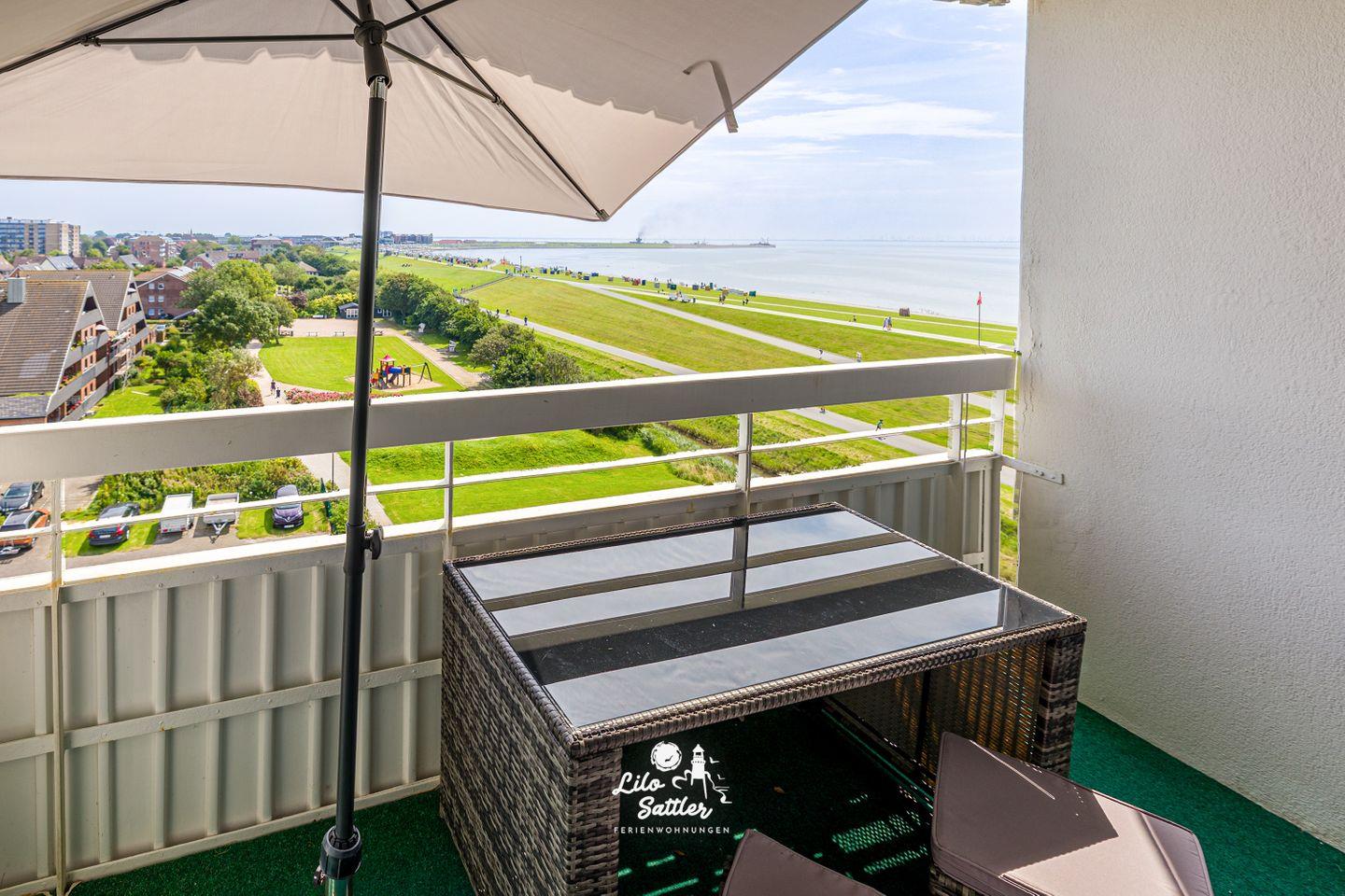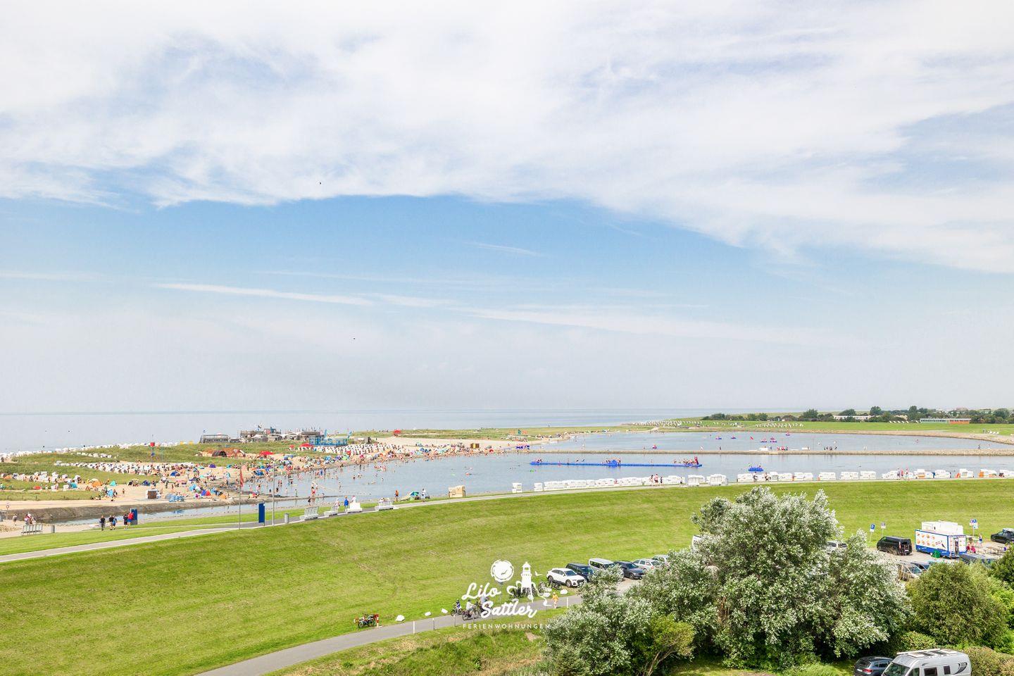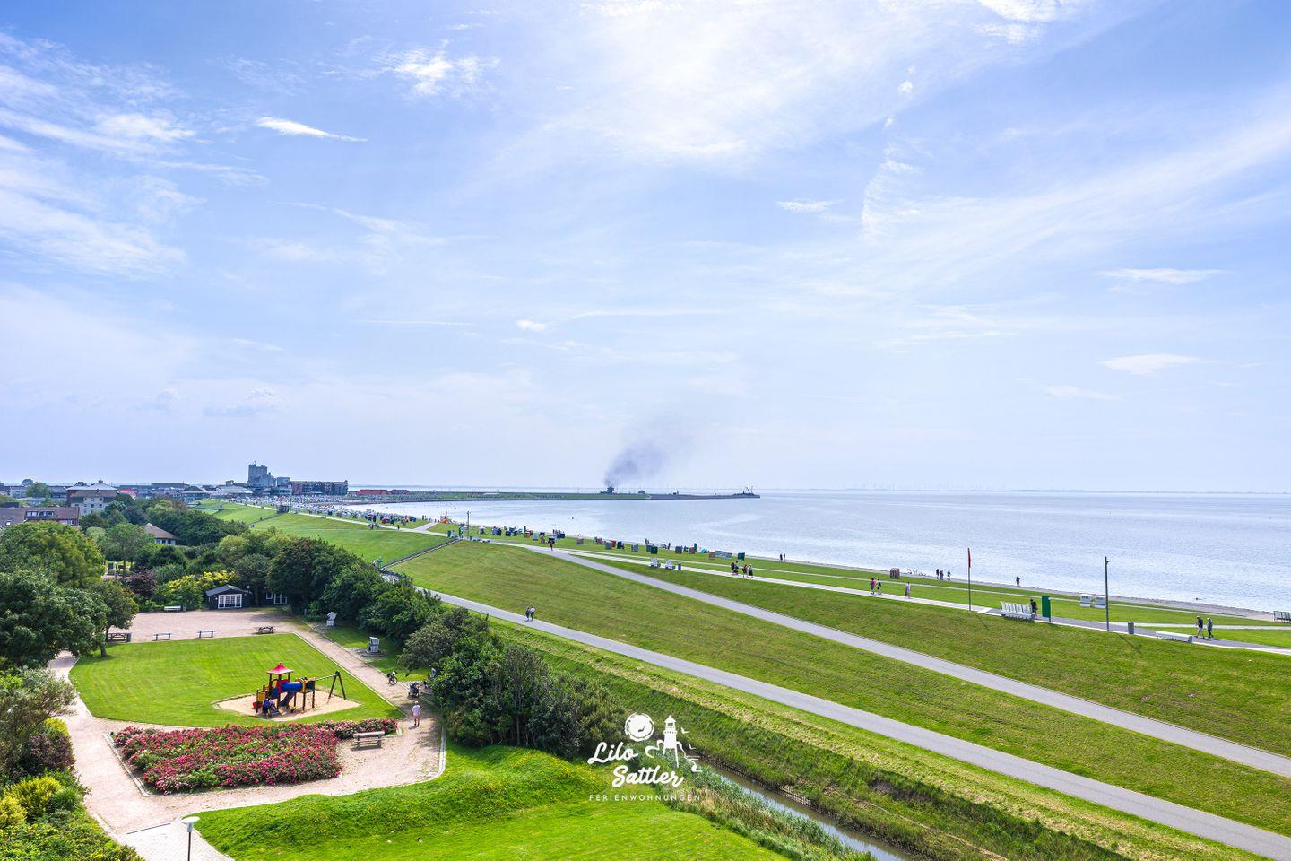 Die direkte Lage am Deich bietet einen herrlichen Blick auf die Nordsee , Strandpromenade und die Ortschaft Büsum.