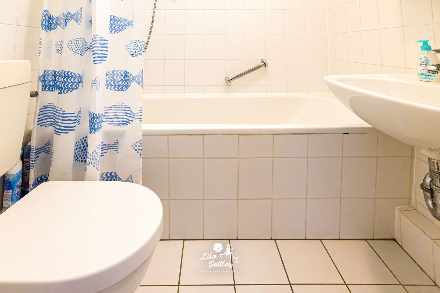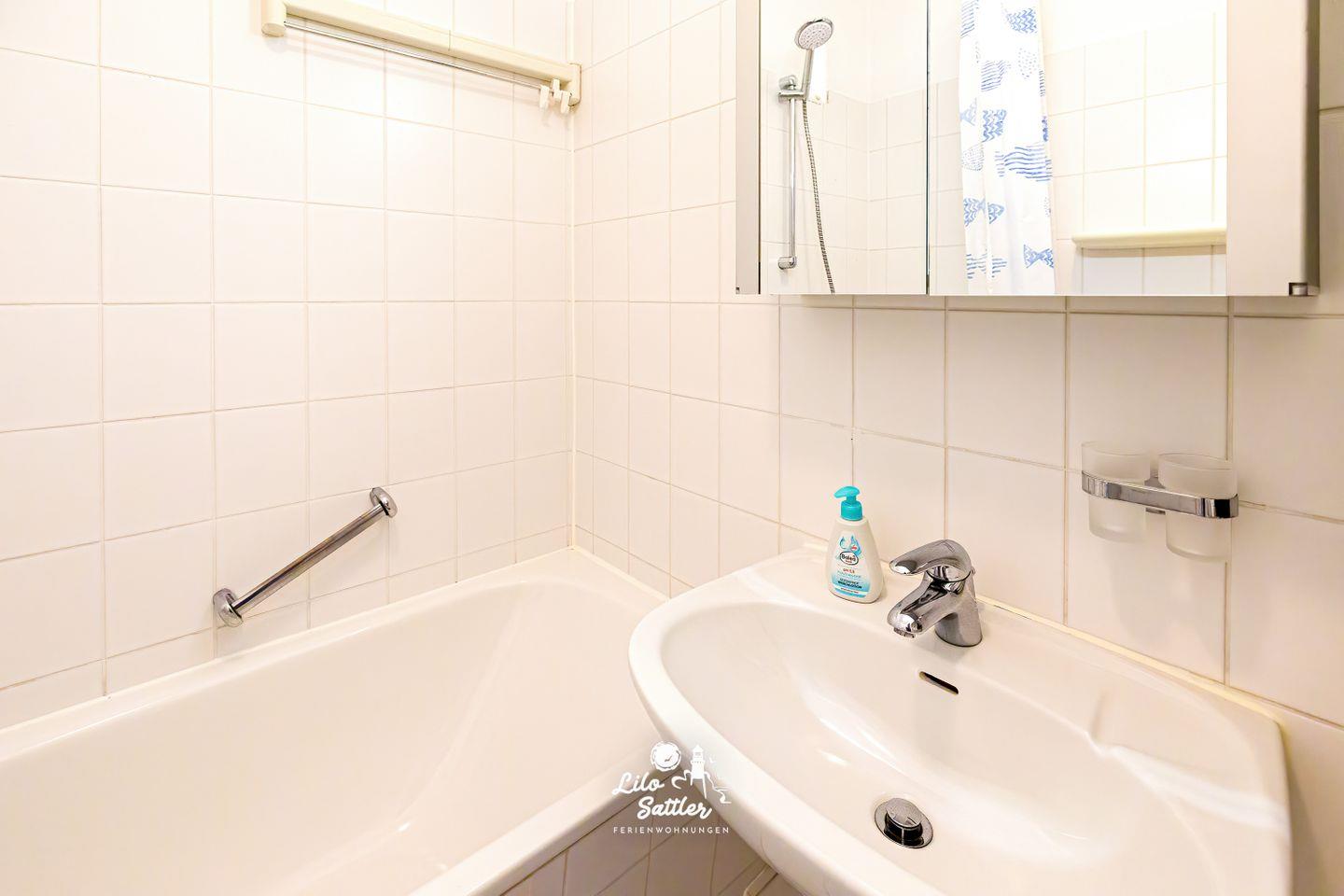 Badewanne mit Duschfunktion, WC, Ablagen, Spiegelschrank, Kosmetikspiegel, Fön, Handtuchwärmer, Abluft