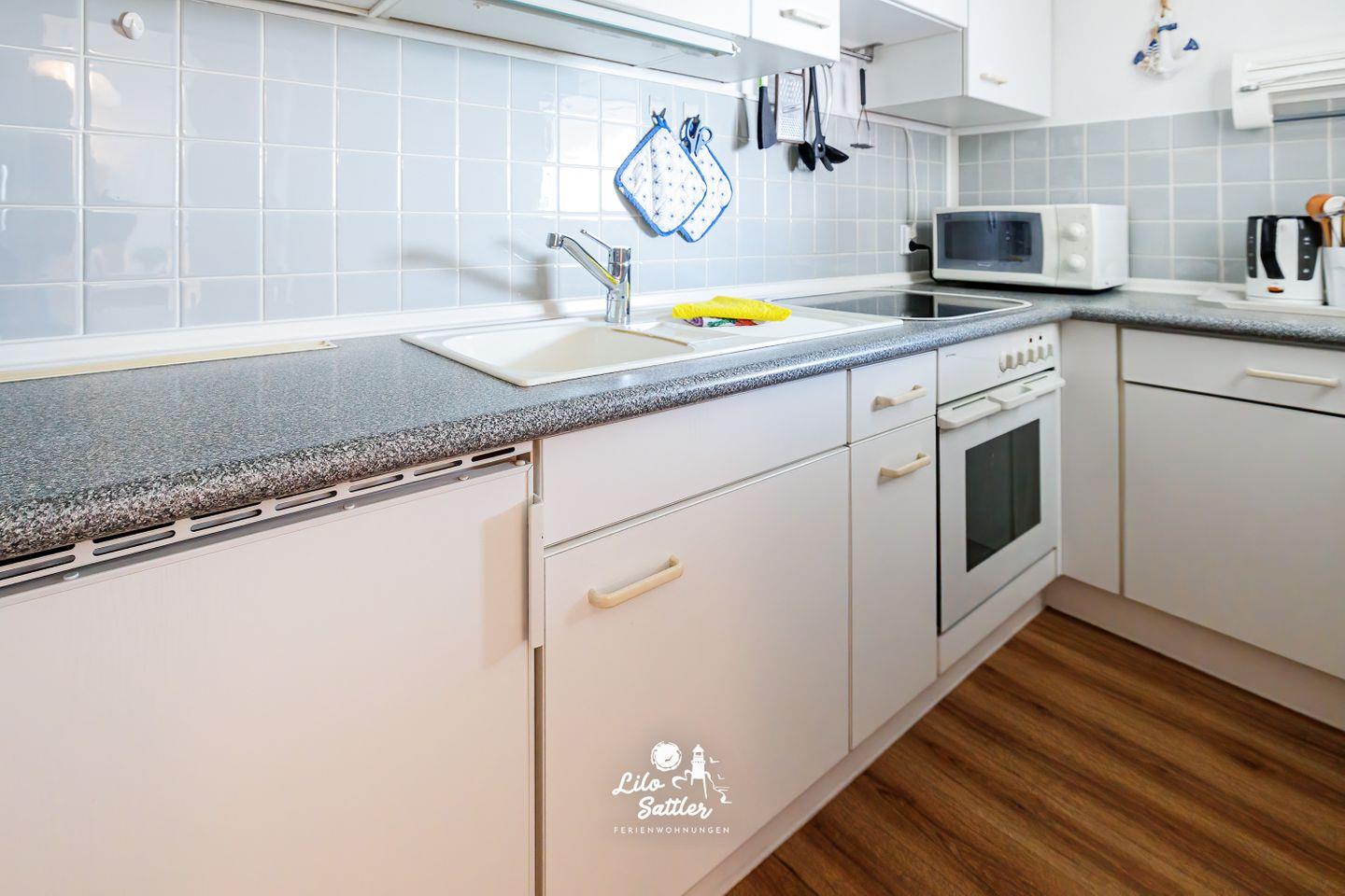4-Platten-Ceranherd, Backofen, Kühlschrank mit Gefrierfach, Mikrowelle, Kaffeemaschine, Tassimo Kapselmaschine, Toaster, Wasserkocher, Eierkocher, Geschirr, Töpfe,