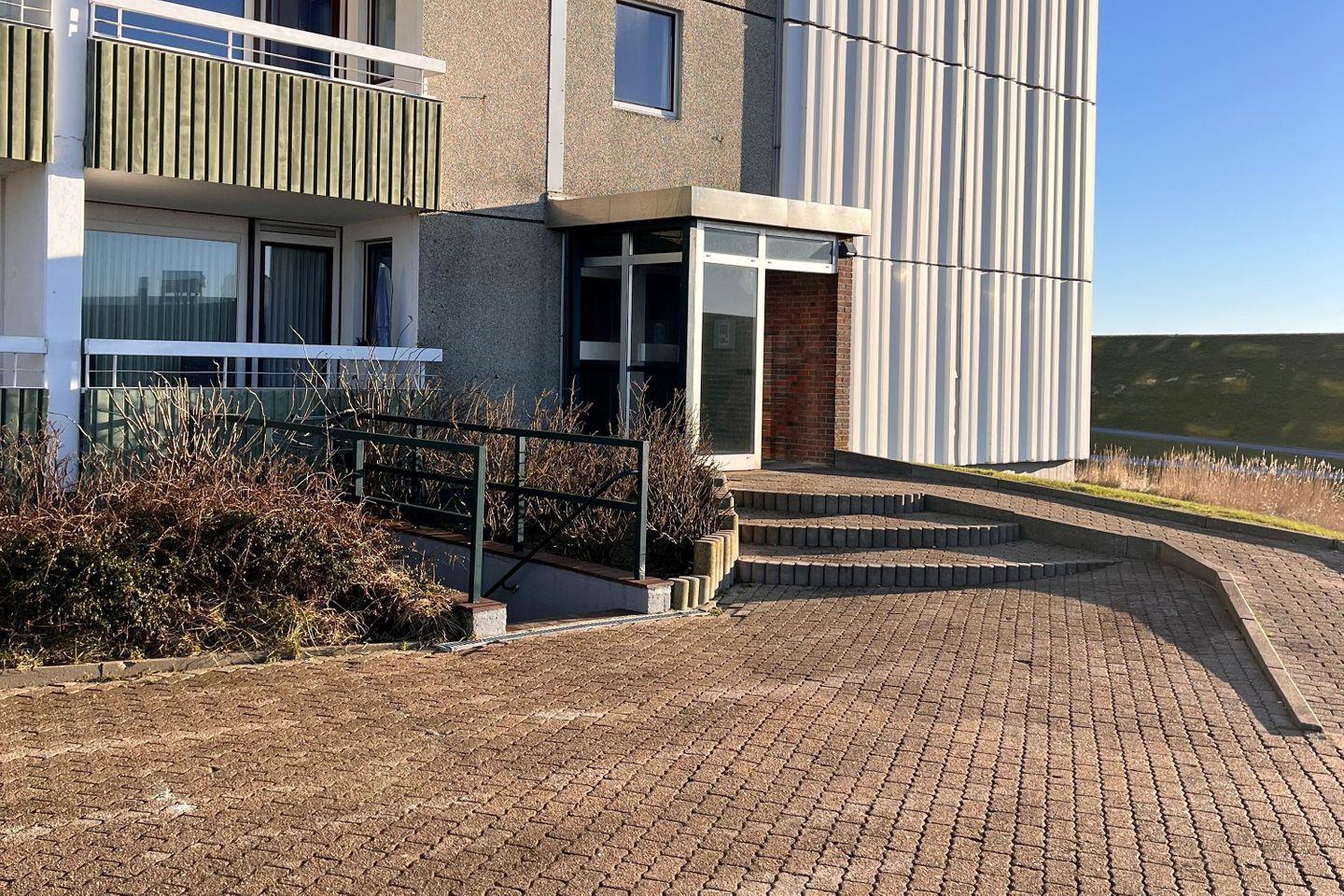 Über ein paar Treppenstufen sowie über einem stufenlosen Nebeneingang sind die Eingänge zum Hochhaus erreichbar.