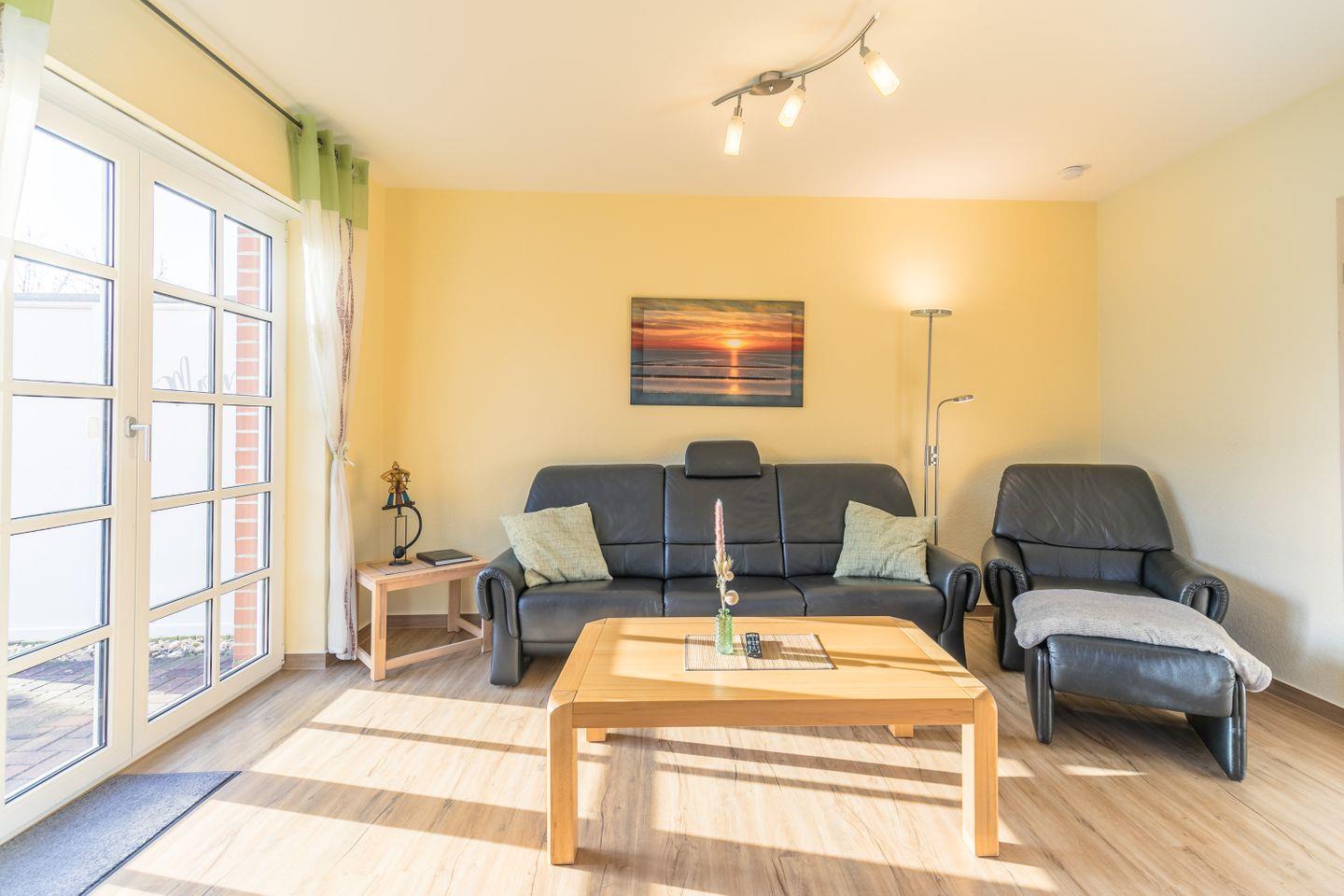 Wohnzimmer: Ledercouch, Sessel mit Fußhocker, Flachbild-Smart-TV, Stereo Anlage, Spiele und Bücher, Zugang zur Terrasse, elektrische Außenjalousie, Blu-Ray-Player