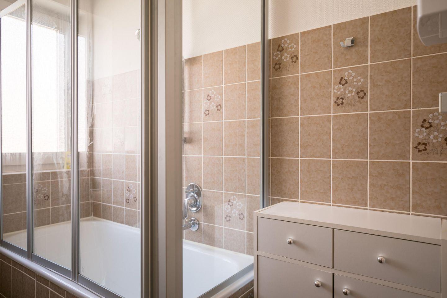 Wannenbad mit Duschtrennwand, Fenster, WC, Hocker, Föhn, Spiegel, Waschbecken