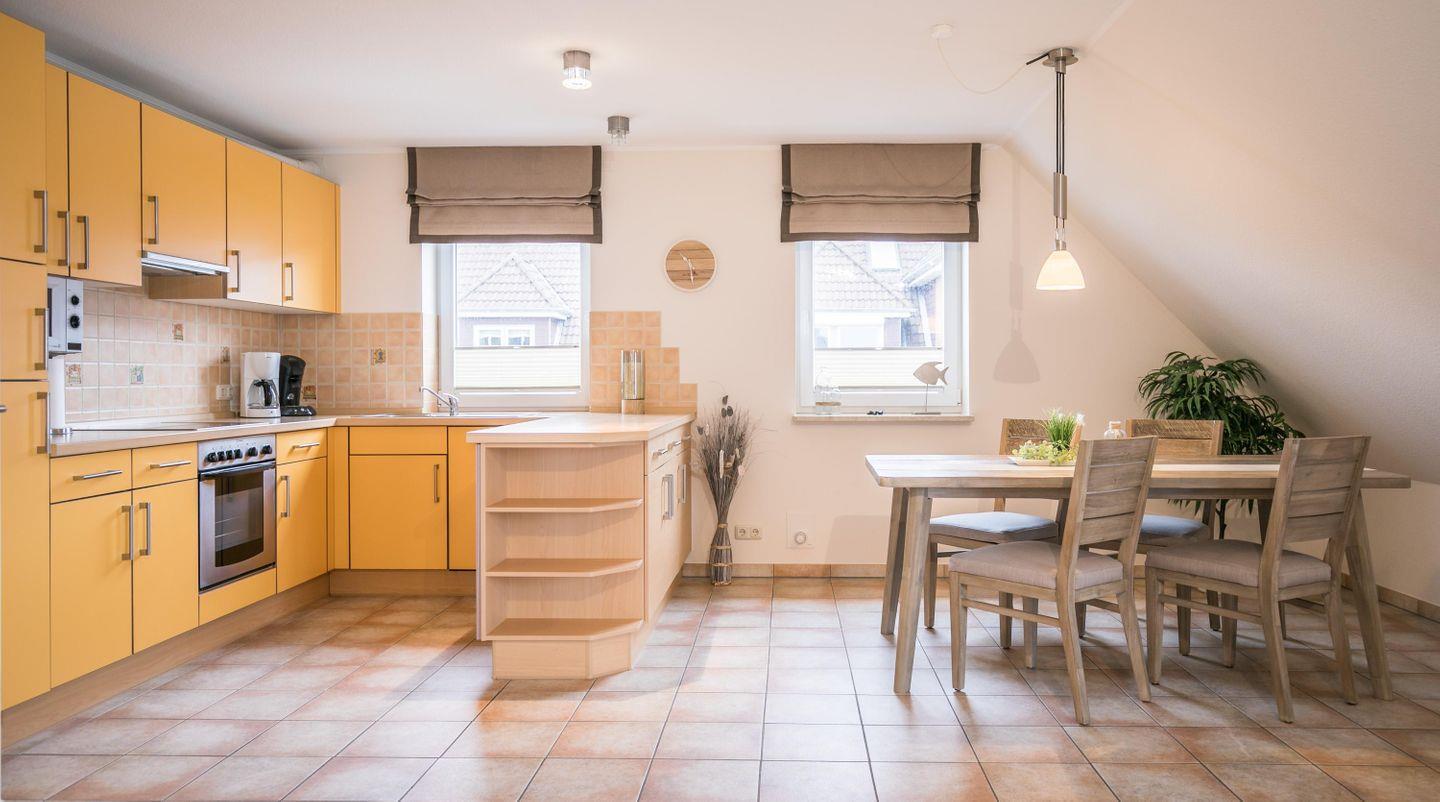 Fußbodenheizung, Einbauküchenzeile, Geschirrspüler, Ceran-Kochfeld, Abluft, Backofen, Mikrowelle, Kühlschrank, kl. Gefrierschrank, Wasserkocher, Toaster, Kaffeemaschine und zusätzlich eine Senseo-Pad-Maschine, Eierkocher