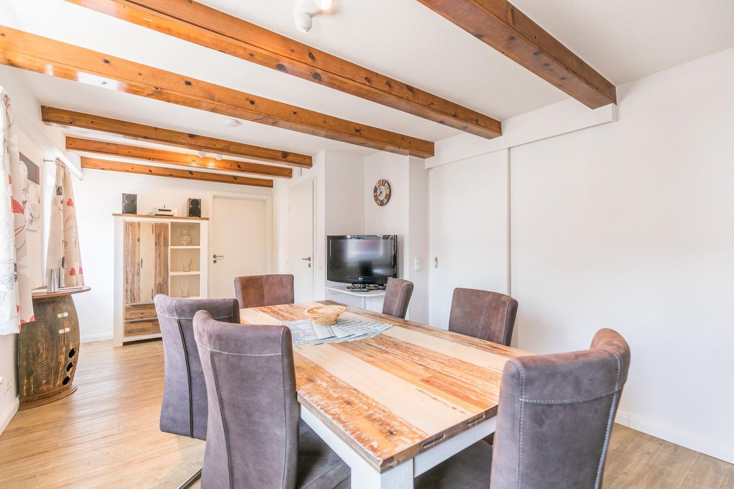 Esstisch, 6 Stühle, Flachbild-TV