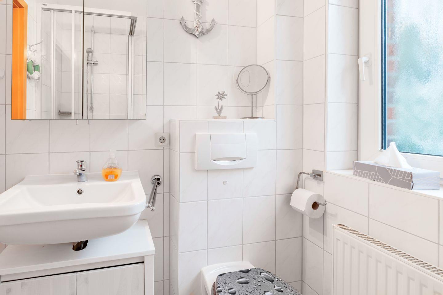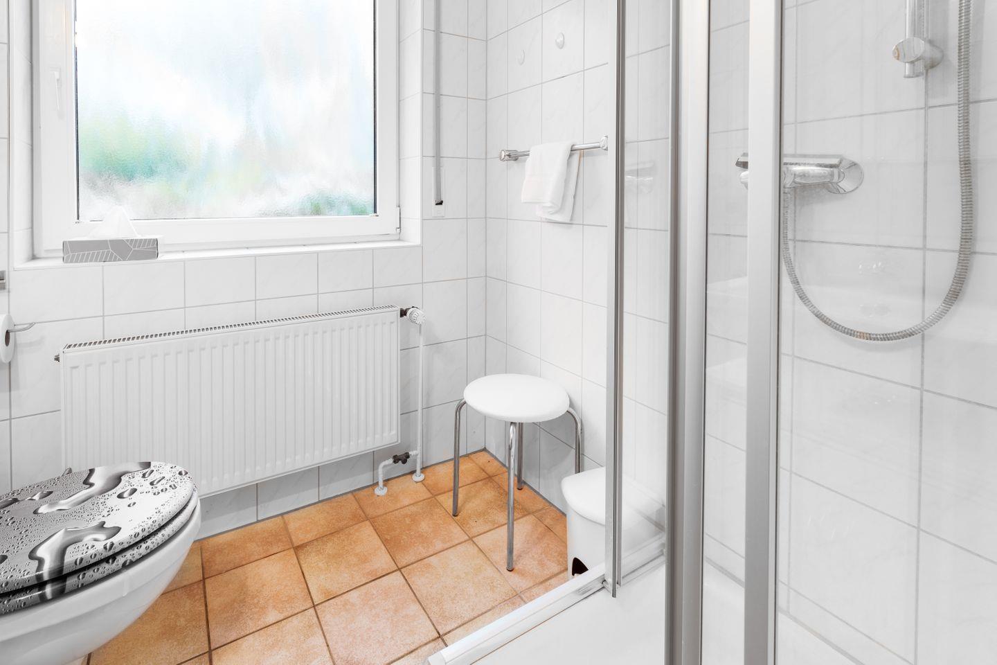 Duschbad, WC, Fußbodenerwärmung, Spiegelschrank, Fenster, Außenjalousie, Föhn
