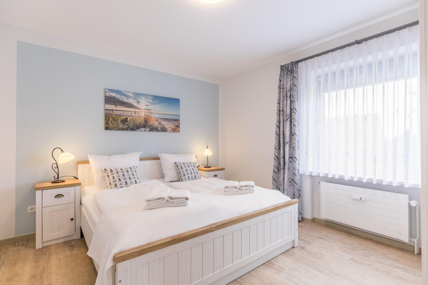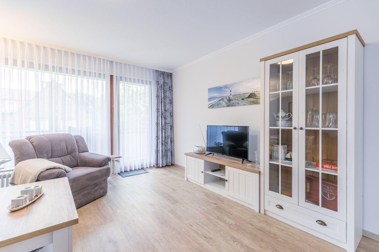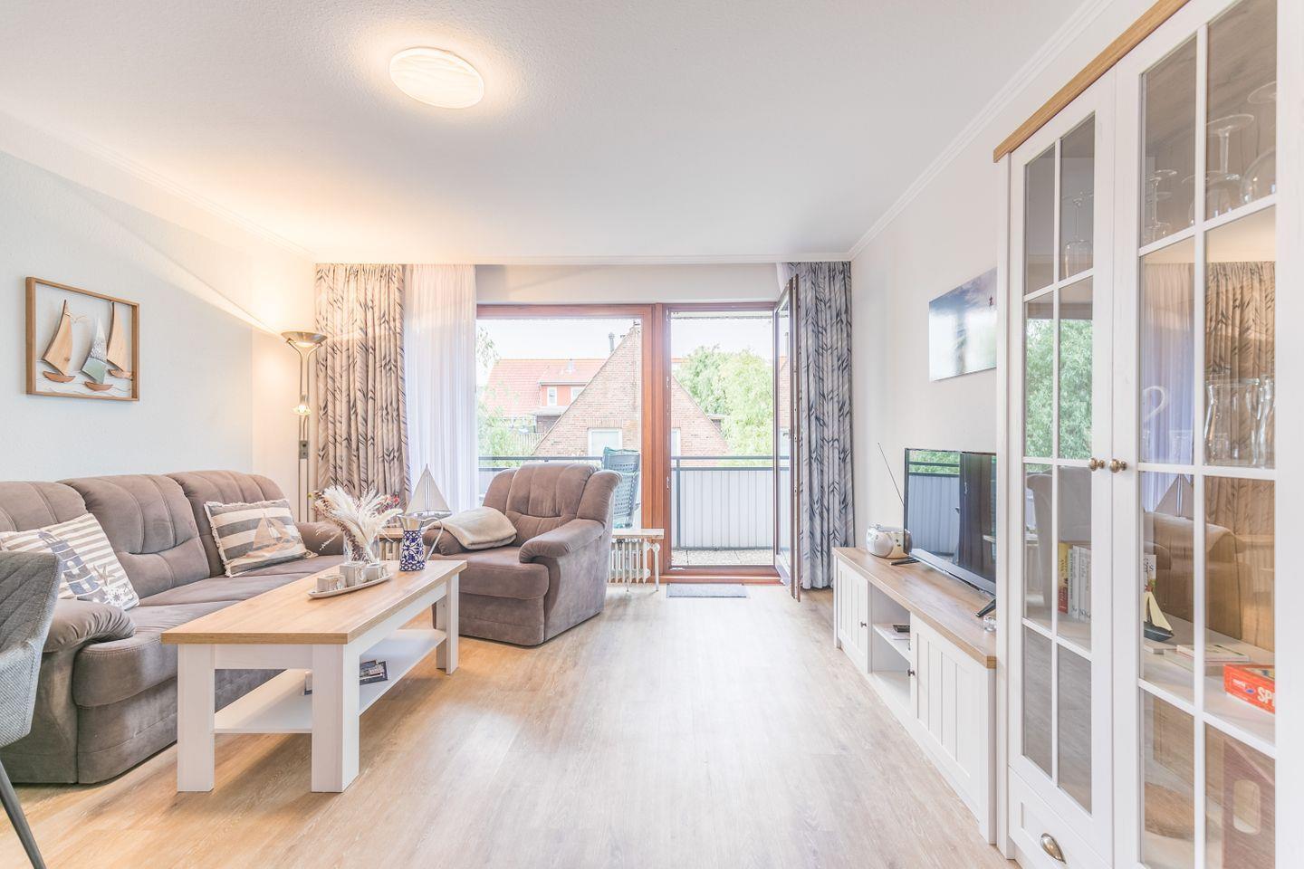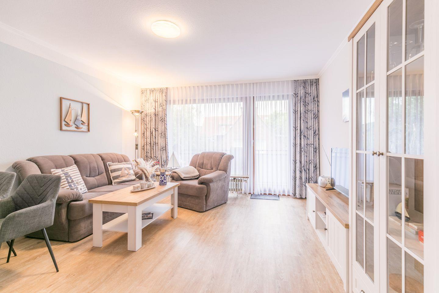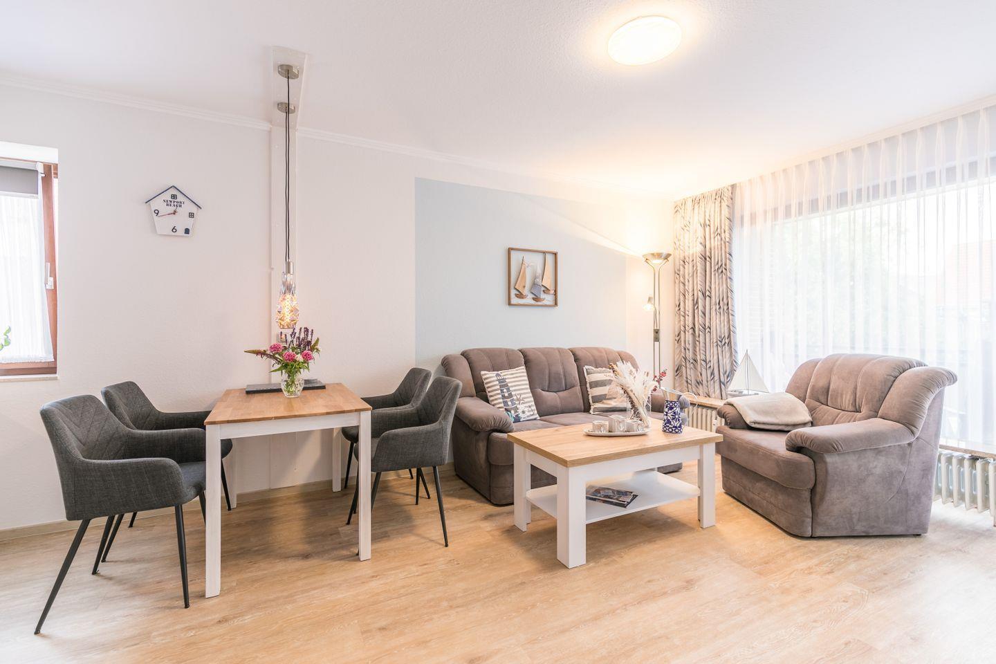 Die Ferienwohnung „Schloss am Meer 6“ bietet dir ein freundliches Zuhause auf Zeit: Wohnen und Essen in einem hellen Raum, Zugang zum Balkon für die Sonne am Nachmittag, ein separates Schlafzimmer mit komfortablem Bett sowie ein gepflegtes Duschbad.