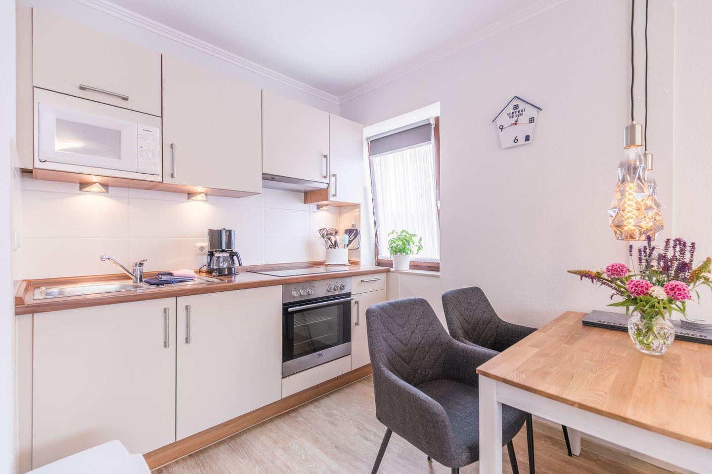 Essecke mit 4 Esszimmerstühlen, Küchenzeile, Herd: Cerankochfeld und Backofen mit Umluft, Mikrowelle, Kühlschrank mit Gefrierfach, Kaffeemaschine, Wasserkocher, Toaster