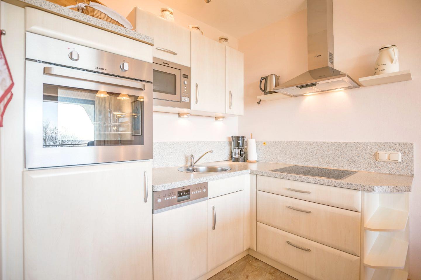 Küchenzeile mit Geschirrspüler, Herd mit Ceranfeld, Backofen, Wasserkocher, Kaffeemaschine, Toaster, Microwelle