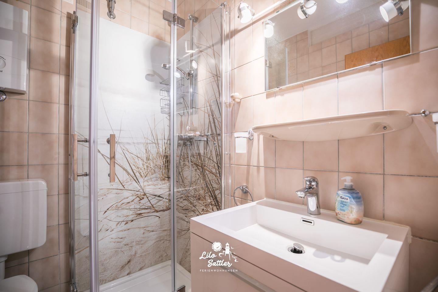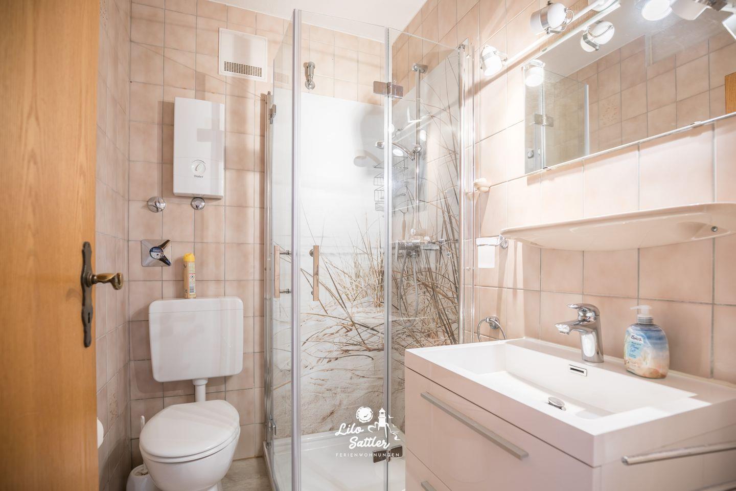 Dusche, WC, Waschbecken mit Unterschrank, Spiegel, Abluft