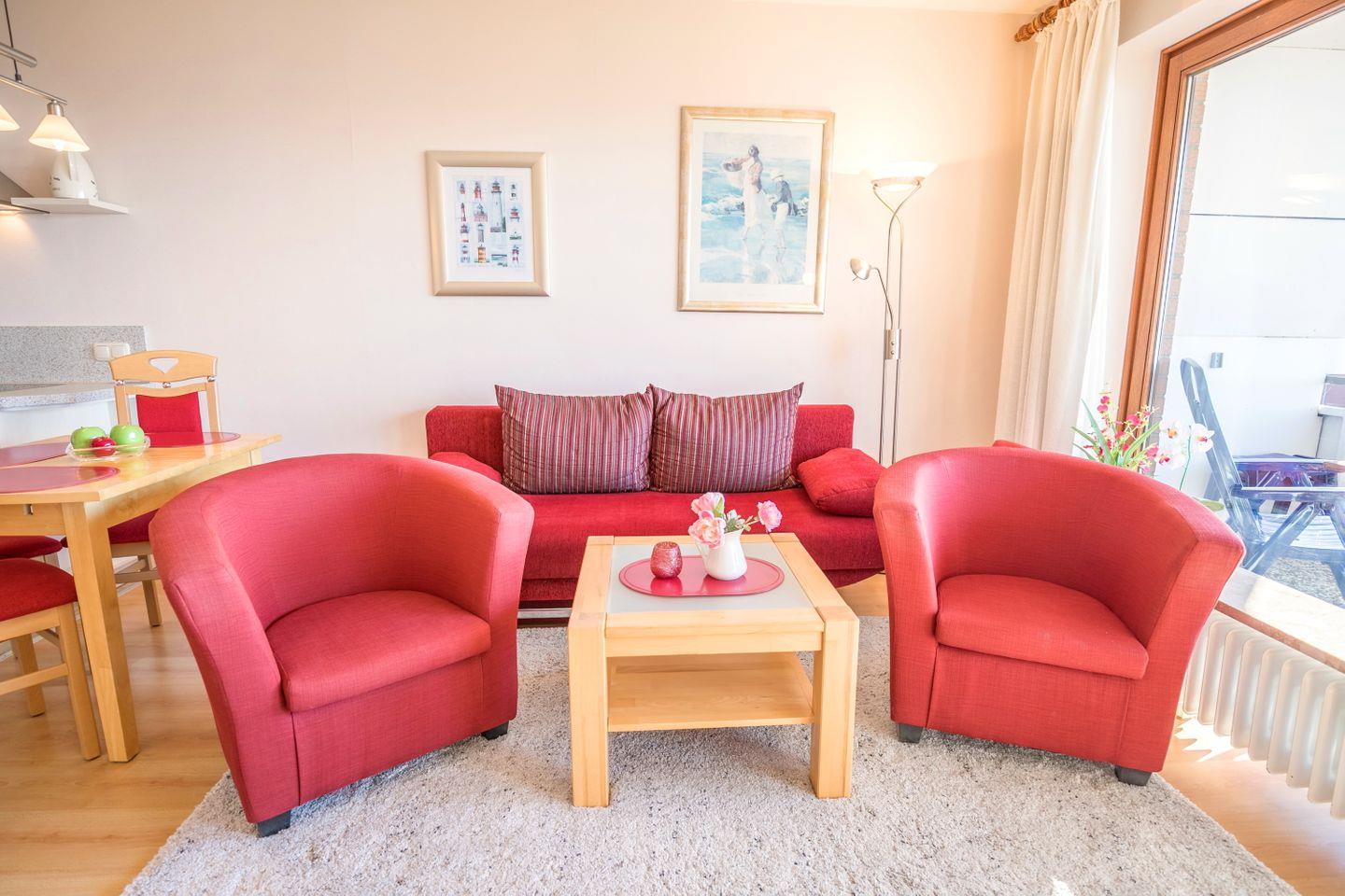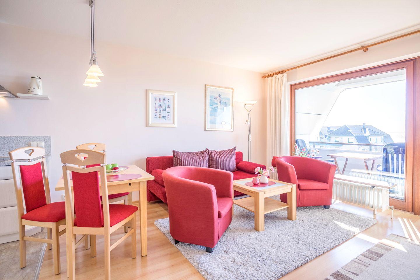 Sofa mit Schlaffunktion (Liegefläche 190cm x 135xm x 40cm), Essplatz mit 4 Stühlen, Flachbild-TV 42 ZOLL, Zugang zum Südbalkon, CD Player, Verdunkelungsrollo