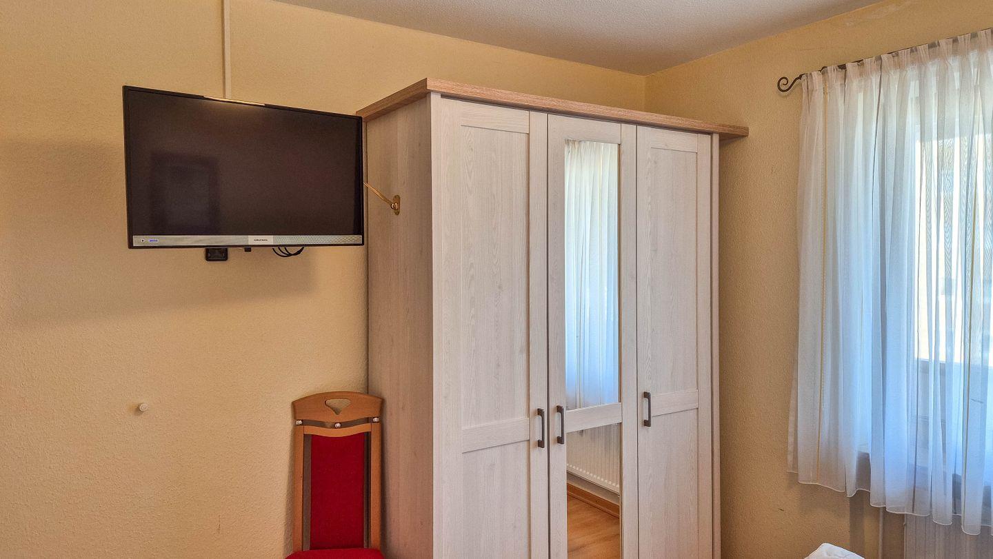 Doppelbett mit getrennten Matratzen (je 200cm x 90cm), Kleiderschrank 3-türig, Nachtkonsolen, Verdunkelungsrollo + Verdunkelungsvorhang, wandhängender Flachbild-TV
