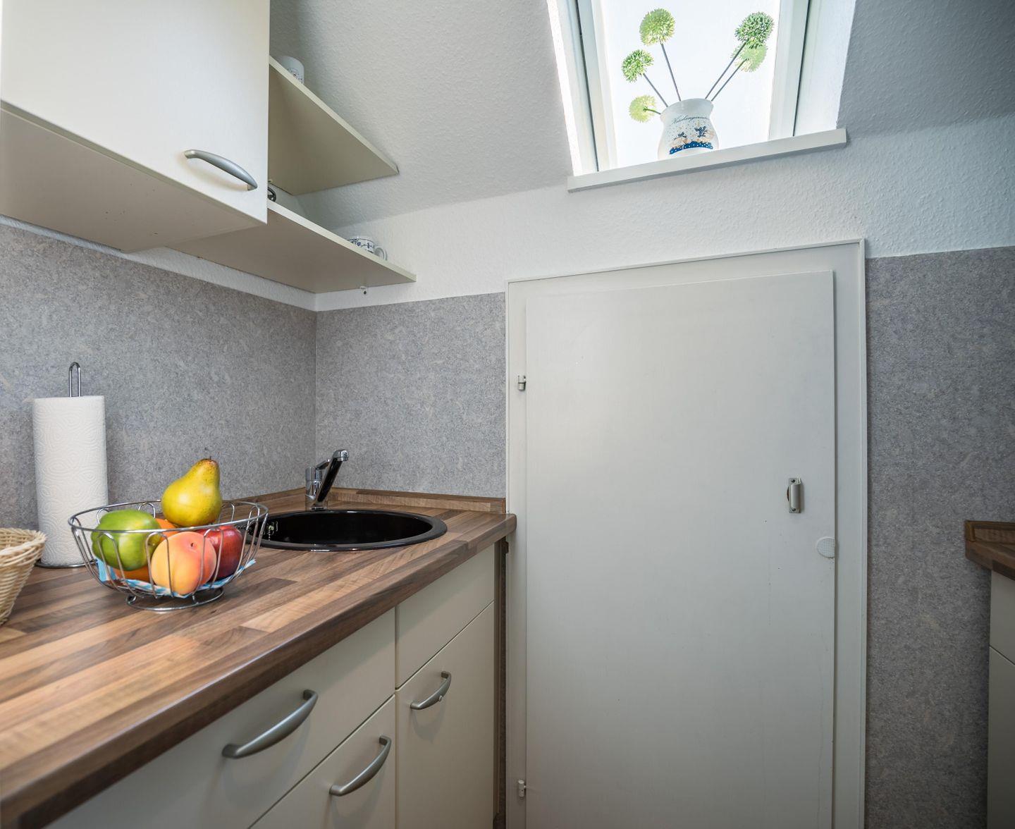 kleine Einbauküche, Cerankochfeld, kleiner Backofen, Kühlschrank mit kleinem Gefrierfach (17 Liter), Kaffeemaschine, Toaster, Wasserkocher