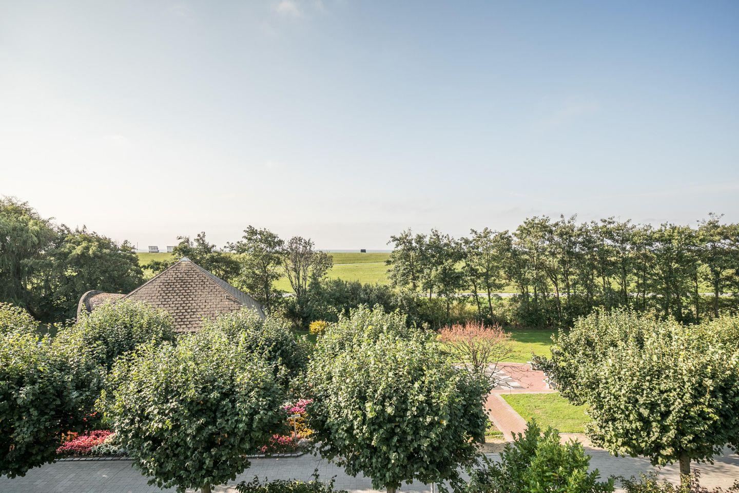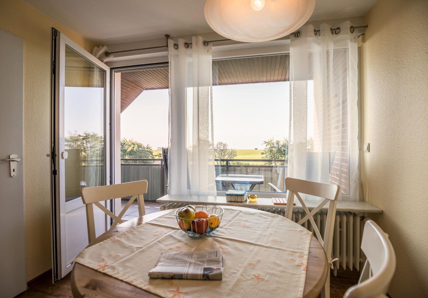 1 kostenfreier Parkplatz am Haus, Fahrradabstellraum, W-LAN, überdachter Balkon, eingeschränkter Meerblick, Deichblick, Blick in den Kurpark