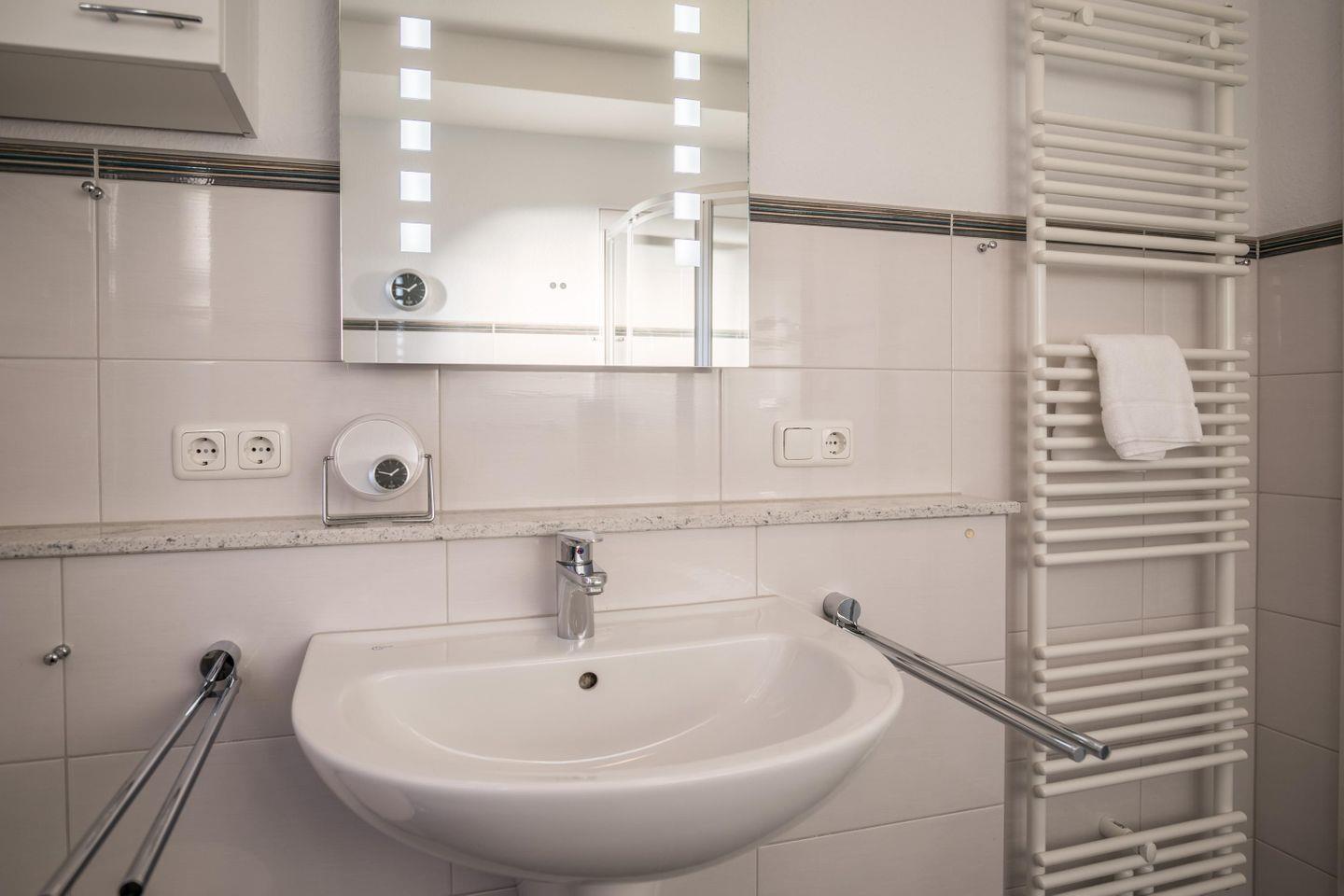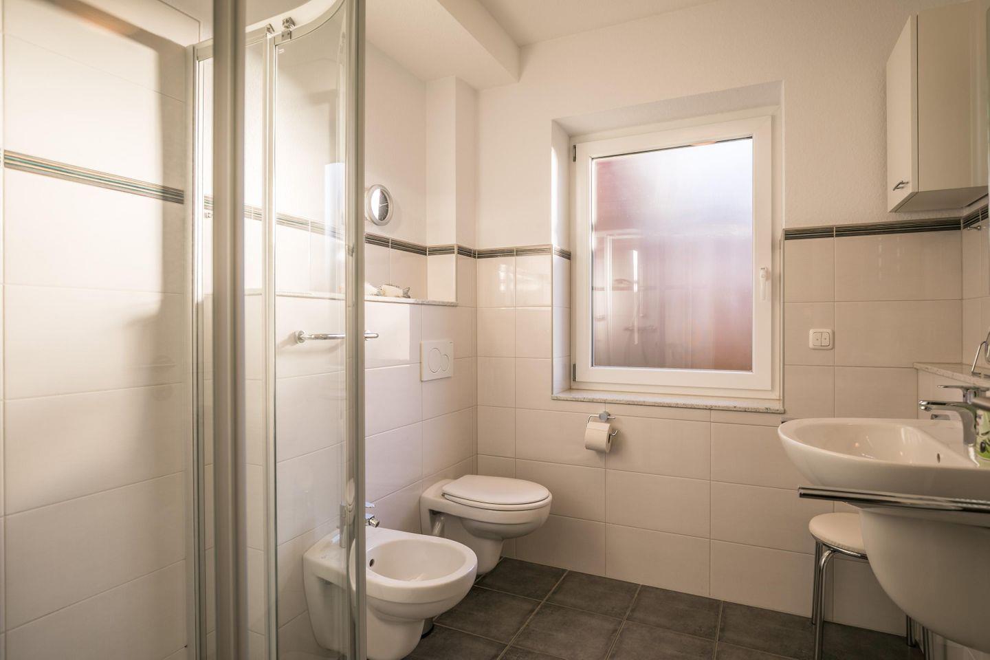 Dusche, WC, Bidet, Ablage, Fön, Handtuchwärmer, Fußbodenheizung, Fenster