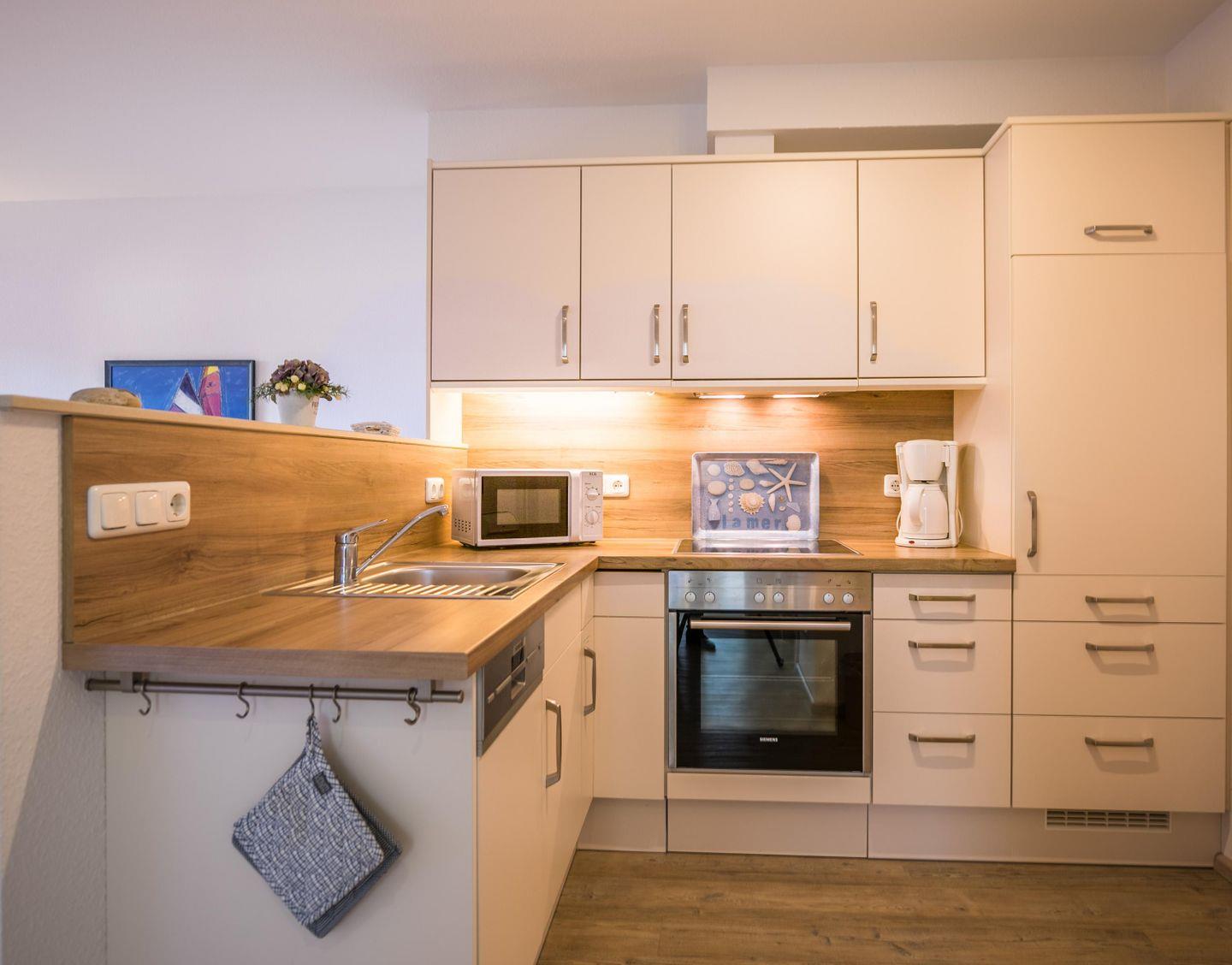 offene Küche, Backofen, Geschirrspüler, Cerankochfeld, Kühlschrank m. Gefrierfach, Toaster, Mikrowelle, Eierkocher, Wasserkocher, Kaffeemaschine, Fußbodenheizung