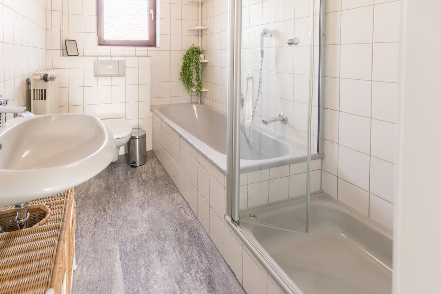 Badewanne, Dusche, beleuchteter Spiegel, Föhn